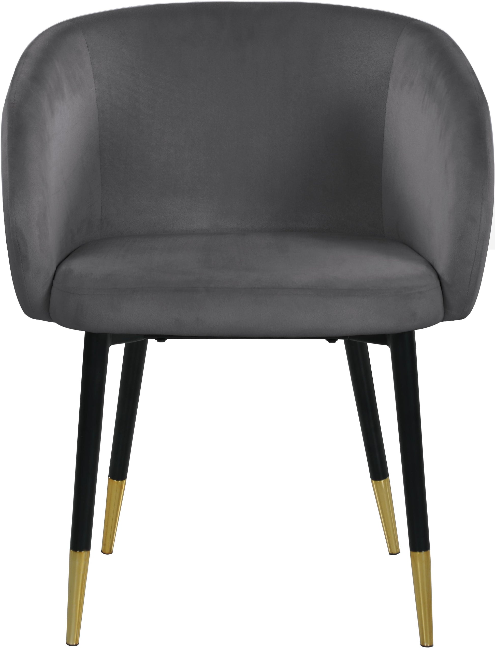 Redefine your living space with this modish Louise Grey Velvet Dining Chair. Featuring stunning velvet grey upholstery and a curved back, this chair offers a comfortable seat for you to relax in. With a frame supported by black metal legs with gold tips, this contemporary chair is not only sturdy and eye-catching; it���s stylish appeal and durability is sure to make it a favorite in your home for years to come.