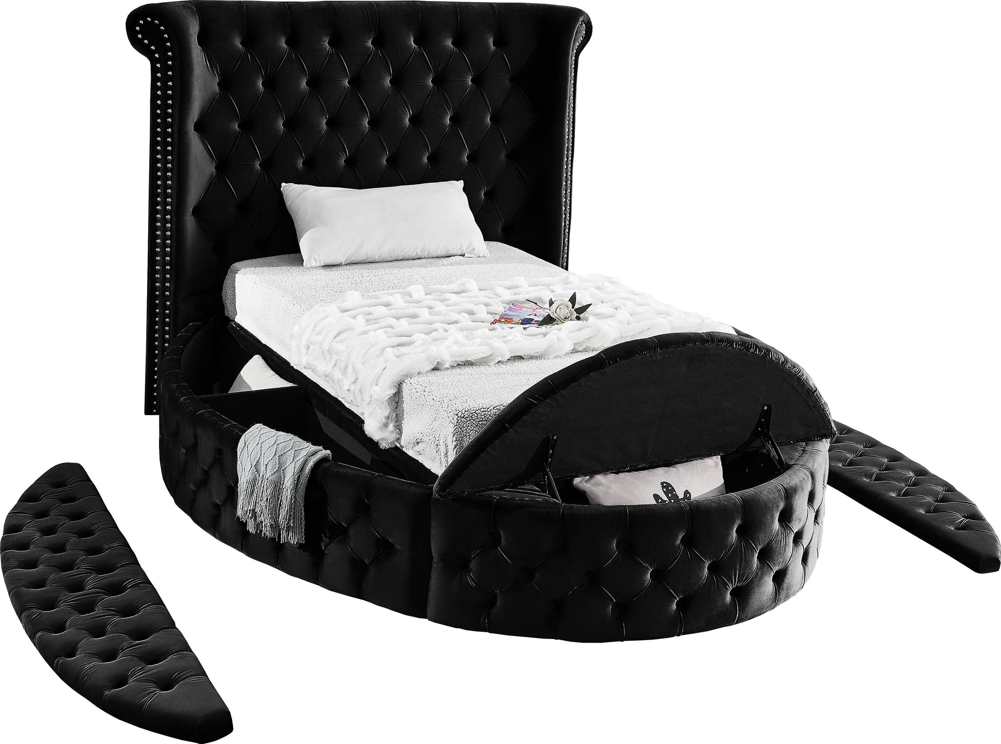 Marvel at the remarkable beauty and graceful lines of this round Luxus black velvet twin size bed. The headboard, footboard and side rails are all adorned with deep button tufting, and there is nailhead trim on both sides of the tall headboard. The footboard and side rails all contain ample storage and seating, making it easy to sit down in comfort so you can put on your pants or shoes.