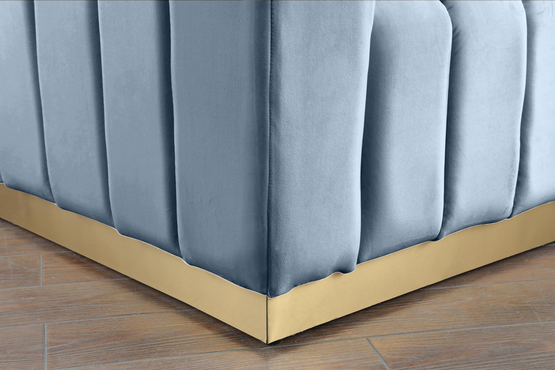 Seat guests in the epitome of comfort and style with this Marlon velvet sofa. This piece is just the thing to showcase your modish style while ensuring total enjoyment from all who are lucky enough to relax on its channel tufted seats. The soft sky blue velvet upholstery adds a beautiful touch to your space and feels great against your skin while the brushed gold stainless steel base lends it a contemporary finish.