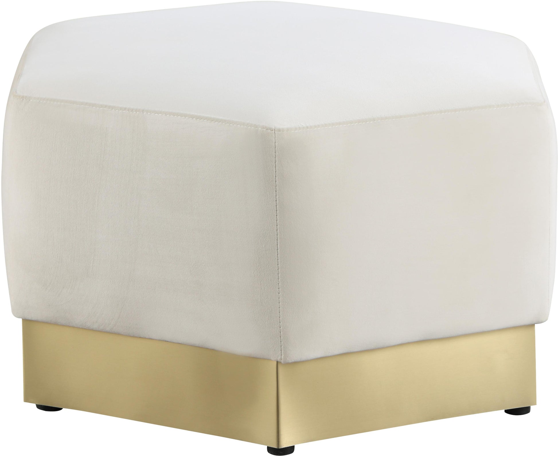 Revamp your living room, den or great room with this Marquis velvet ottoman. This handsome piece features a bold contemporary look that���s well at home in most modern d?�cor themes. A well-padded top ensures total comfort for your legs while you relax. Upholstered in soft cream velvet, this piece fits in nicely with nearly any other colors in the room, and the brushed gold stainless steel base ensures its up-to-the-minute look.