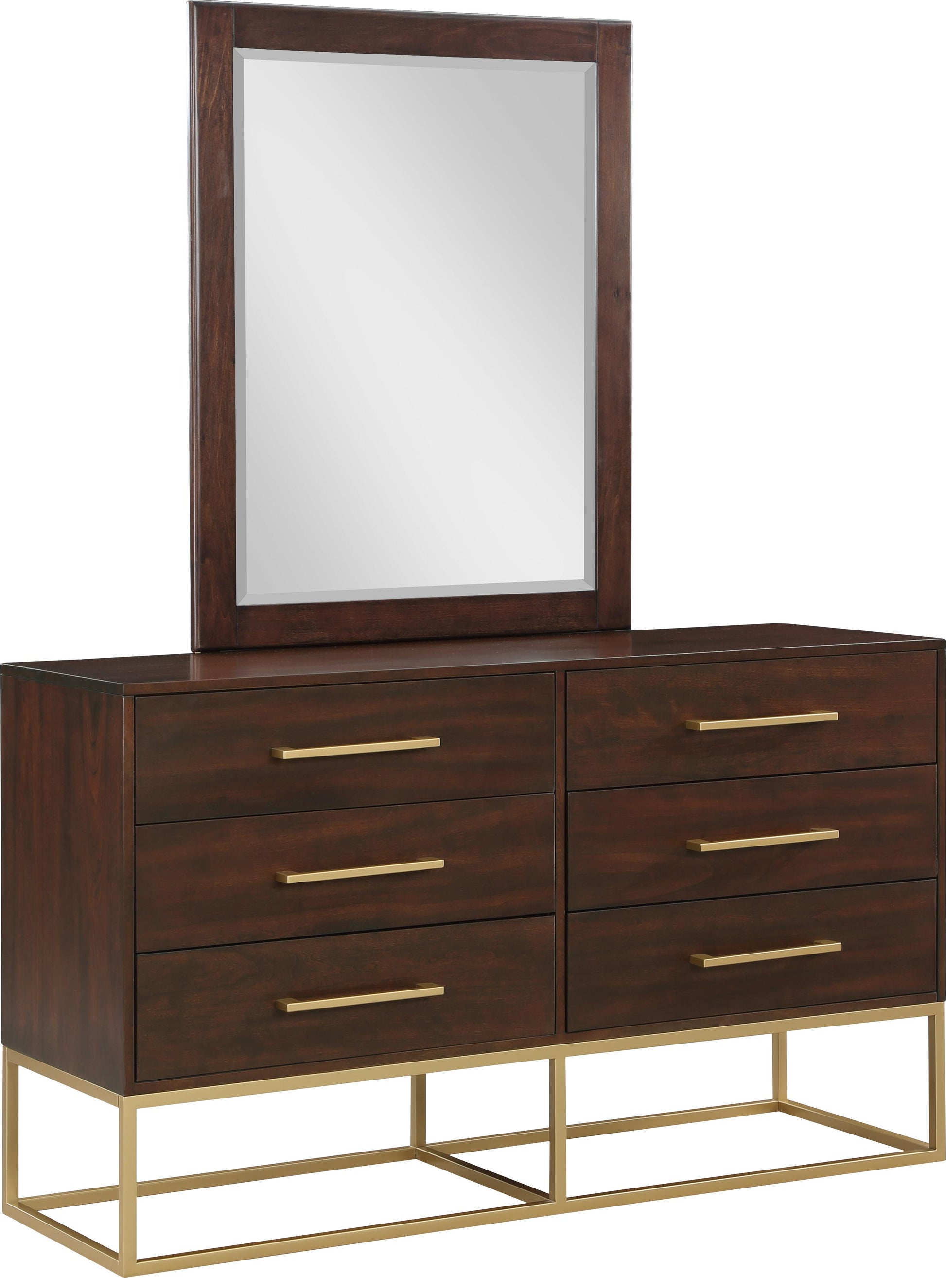 Outfit your space with this Maxine dresser, part of the Maxine collection of contemporary bedroom furniture. This lovely chest features a dark cherry finish over birch veneer construction for durability, strength, and resilience, and it���s equipped with brushed gold metal legs and hardware for a simplistic yet elegant finish. Pair this item with other bedroom essentials in the same collection for a beautiful look in your room.