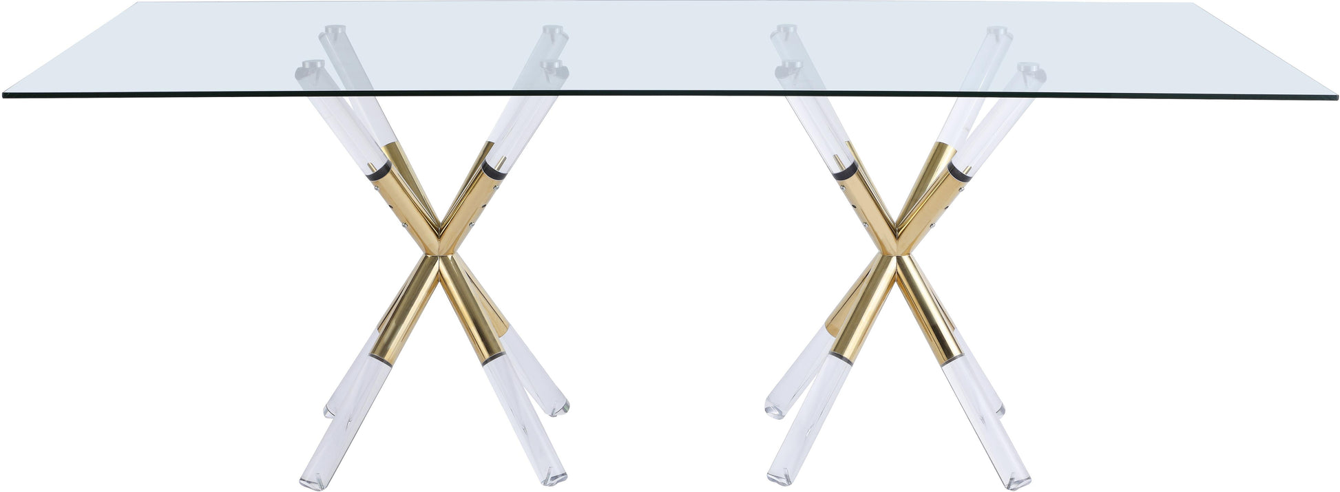 Bring modern pizzazz to your living room with this Mercury Acrylic Gold Dining Table by Meridian Furniture. The base features a pedestal design with acrylic gold legs for a touch of contemporary fun. The tempered glass top offers plenty of room for seating guests for intimate meals together. The top is clear, so you can easily see the beauty of the metallic legs showing through, giving your living room or den a little something extra.