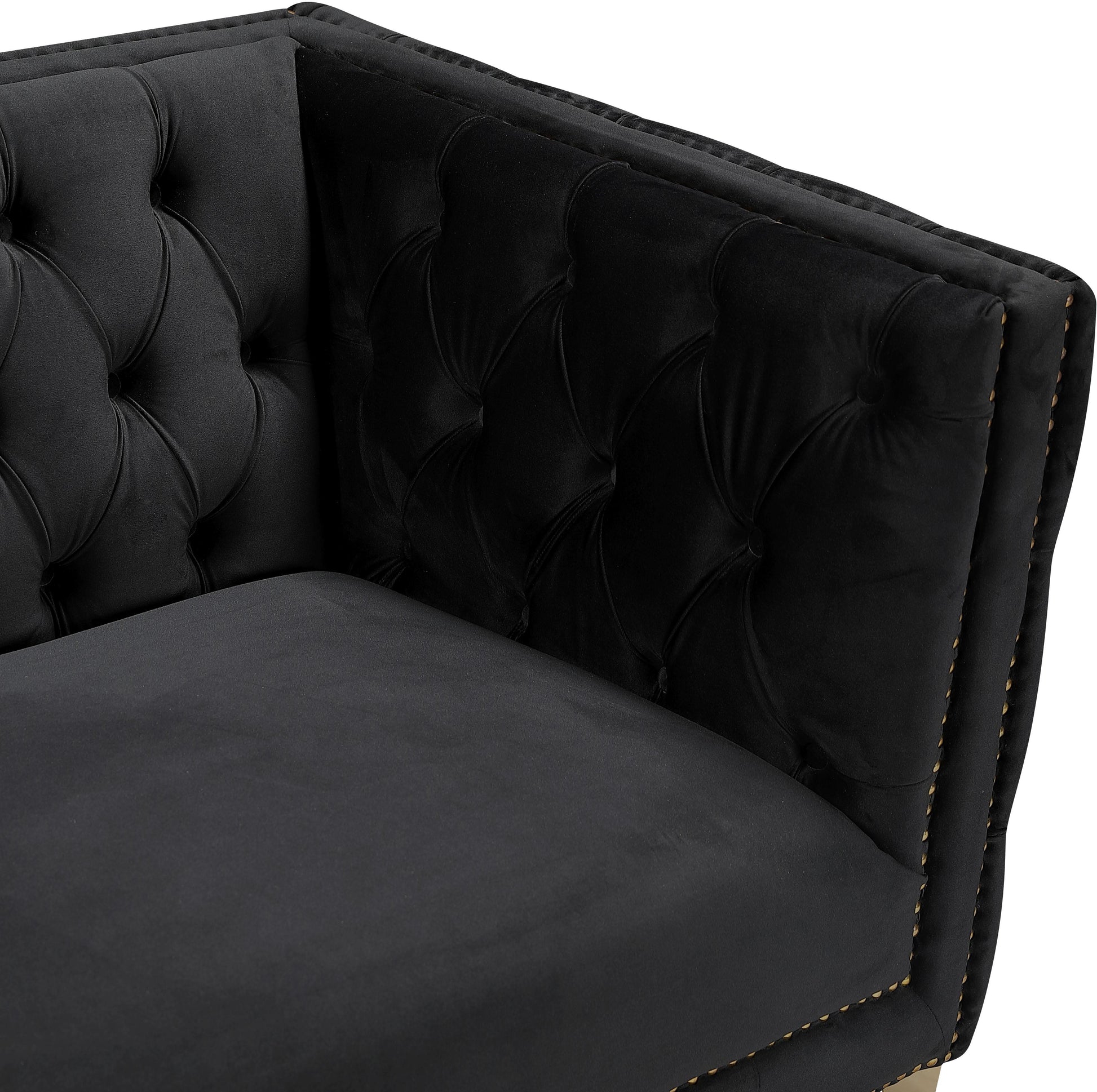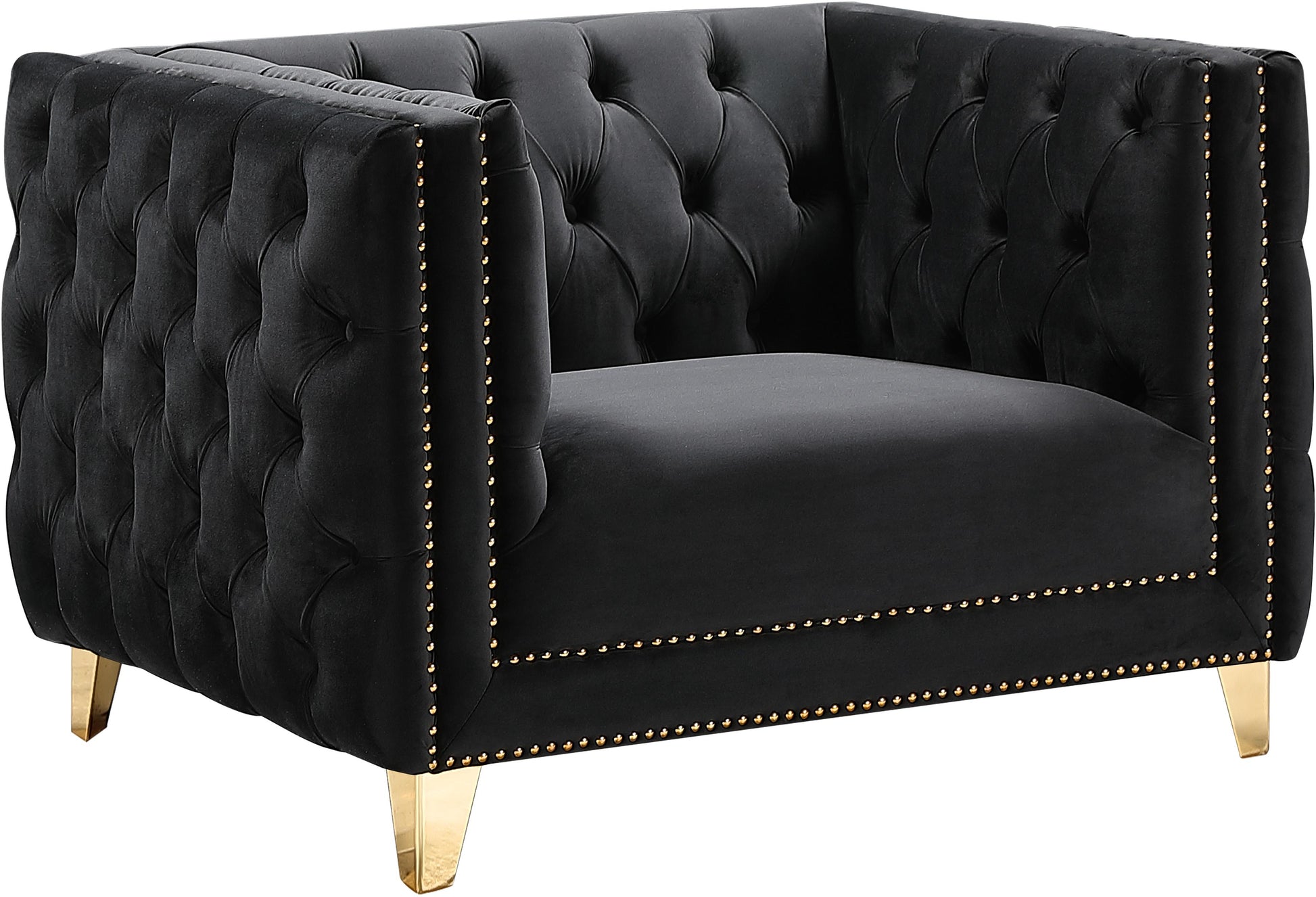 Upholstered in soft black velvet, this Michelle chair is sumptuously glamorous. Designed for upscale living, this chair features rich gold nail head trim and gold iron legs that keep it grounded in contemporary beauty. Tufted material covers every inch of this unit, and button tufting ensures that the unit stays plump and comfortable and holds up well to continual use. Pair it with other items in the collection for a cohesive look.