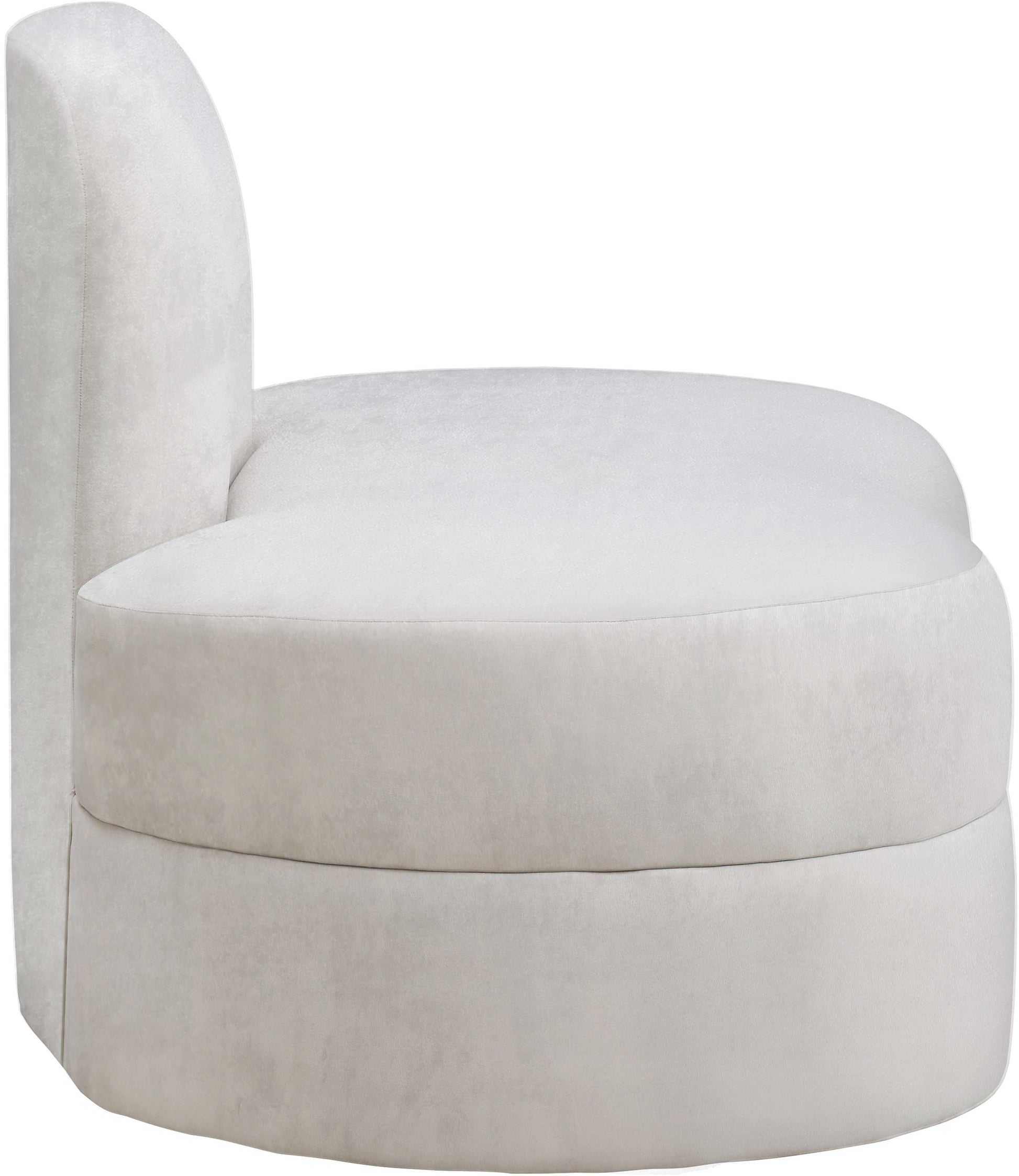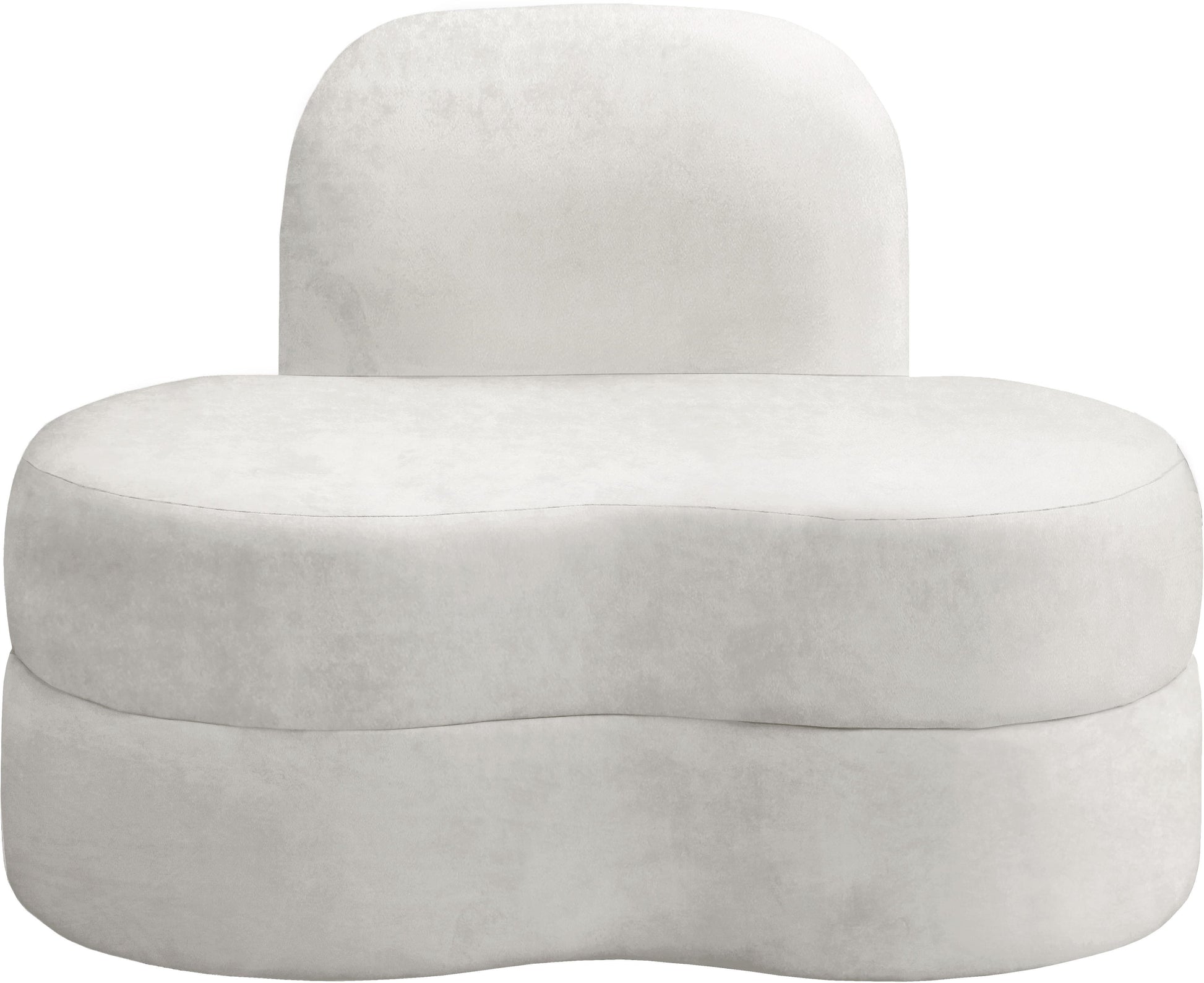 Relax and unwind from the soft comforting confines of this Mitzy velvet chair. This elegantly eye-catching chair has a lot to offer with its uber contemporary design and its soft cream velvet. Its unique kidney-shaped design lends it to modern d?�cor themes with ease, and the upholstered base provides sturdy support for you as you sit and destress in front of the TV.