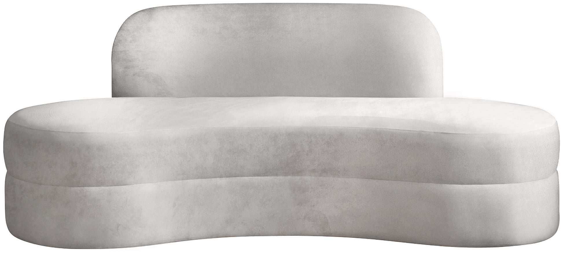 Relax and unwind from the soft comforting confines of this Mitzy velvet sofa. This elegantly eye-catching chair has a lot to offer with its uber contemporary design and its soft cream velvet. Its unique kidney-shaped design lends it to modern d?�cor themes with ease, and the upholstered base provides sturdy support for you as you sit and destress in front of the TV.