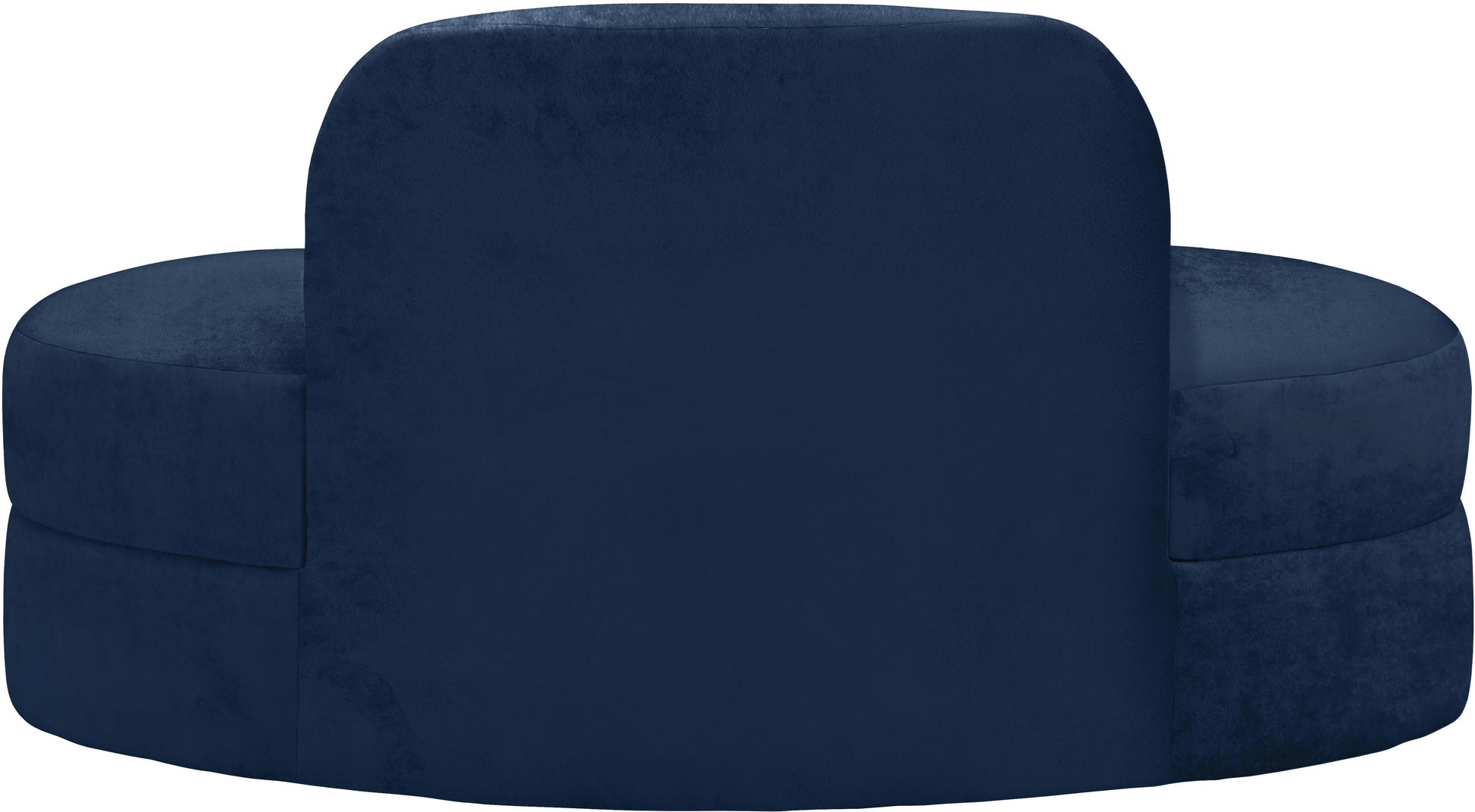 Relax and unwind from the soft comforting confines of this Mitzy velvet love seat. This elegantly eye-catching chair has a lot to offer with its uber contemporary design and its soft navy velvet. Its unique kidney-shaped design lends it to modern d?�cor themes with ease, and the upholstered base provides sturdy support for you as you sit and destress in front of the TV.