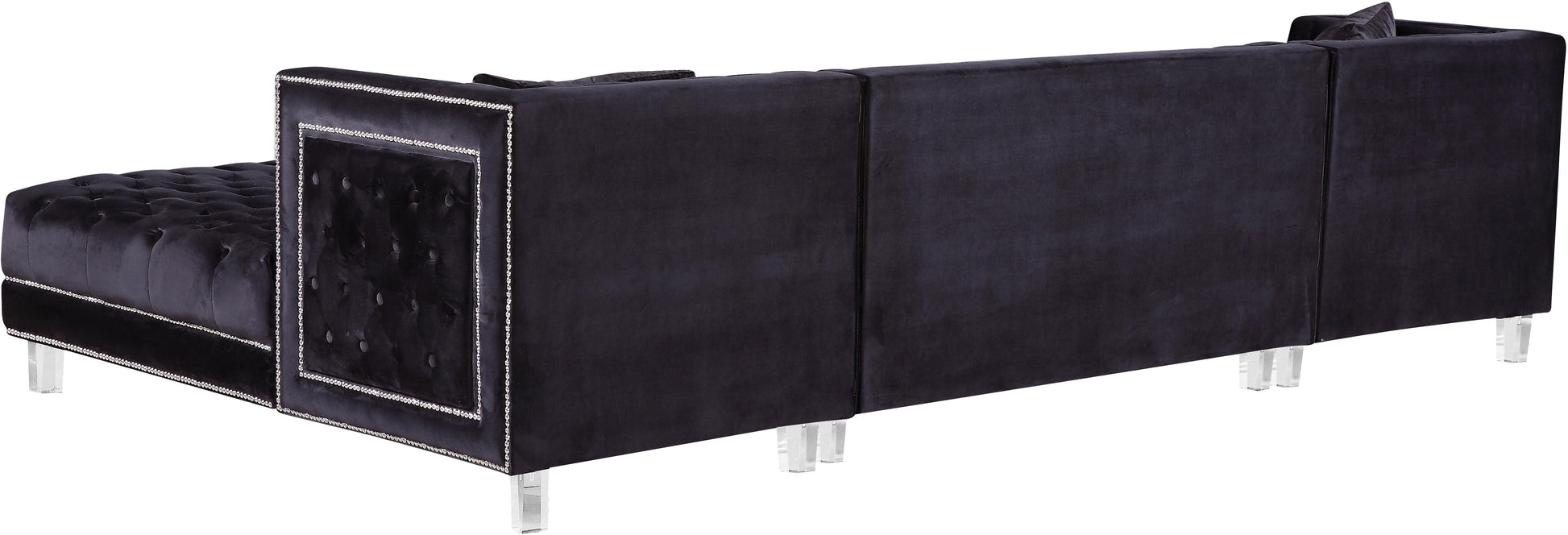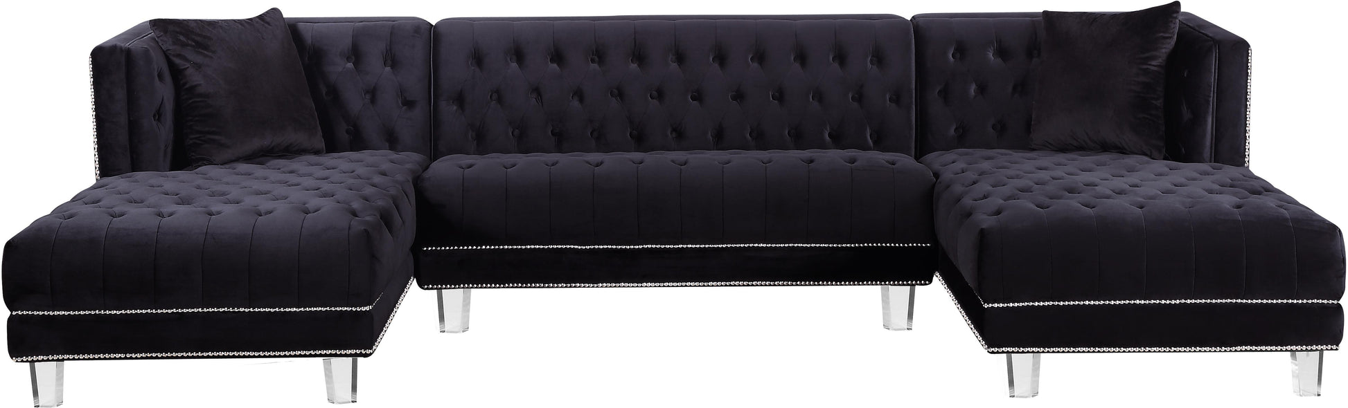 Grab a friend and get comfortable on this beautiful Moda black velvet three-piece sectional sofa. This astounding sectional epitomizes luxurious living and features lots of room for the whole gang to get comfortable. Double chaise lounges on each end gives you space for stretching out for a quick cat nap, while deep tufting adds to the luxurious appeal of this unit. Acrylic lucite legs and a sturdy frame make this sectional a durable addition to your living room or den, while the included pillows give a homey slant to an otherwise uber contemporary sectional.