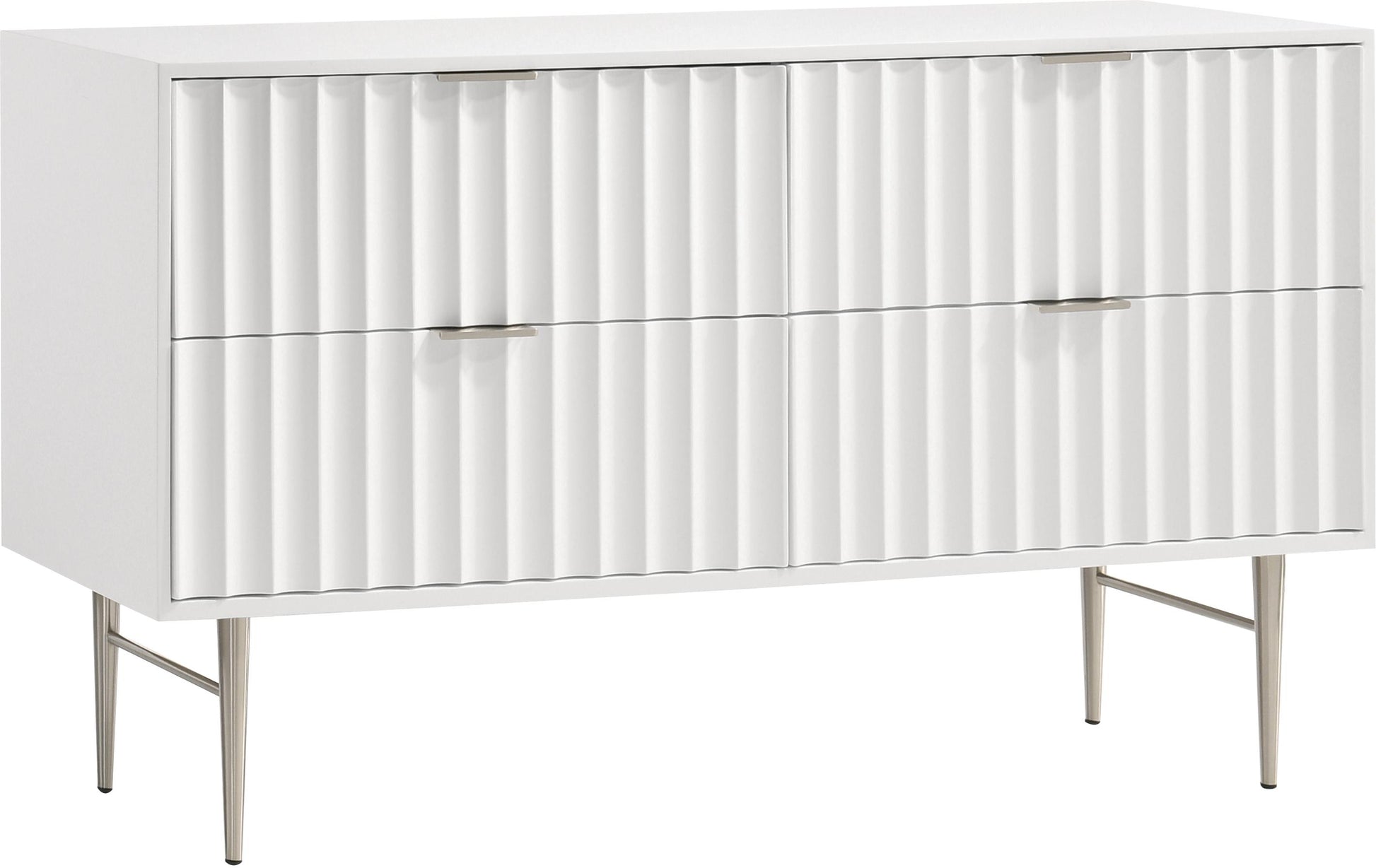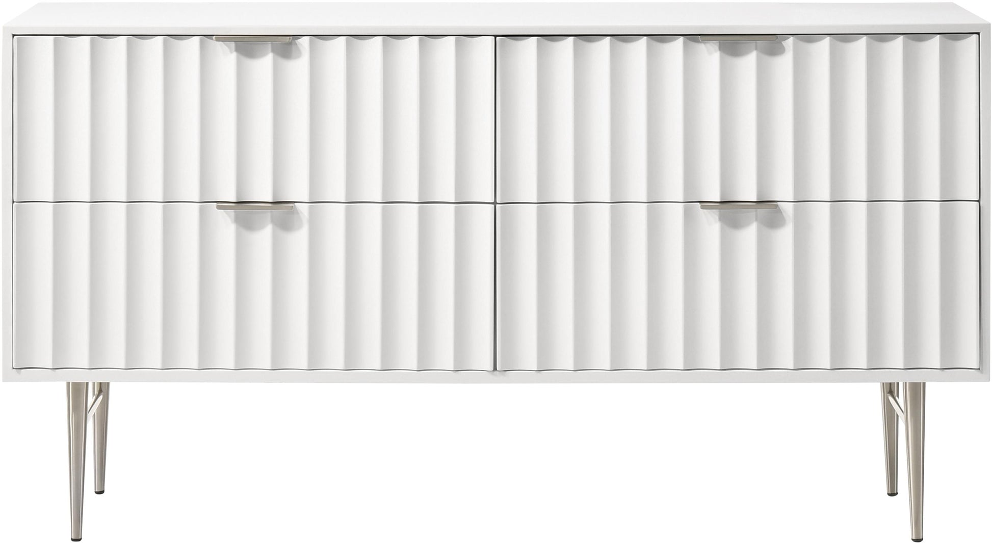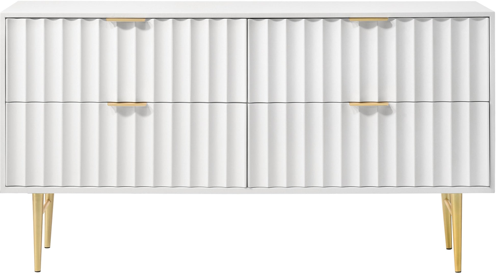 Embody industrialist style with this Modernist dresser in a white medium gloss finish. Utilitarian but sculptural in design, this piece features a ridged, textured look that is chic but sleek. It rests on brushed gold steel legs and has gold brushed handles for a bit of regality. Combine this piece with other items in the Modernist lineup for a cohesive finish to your room makeover.