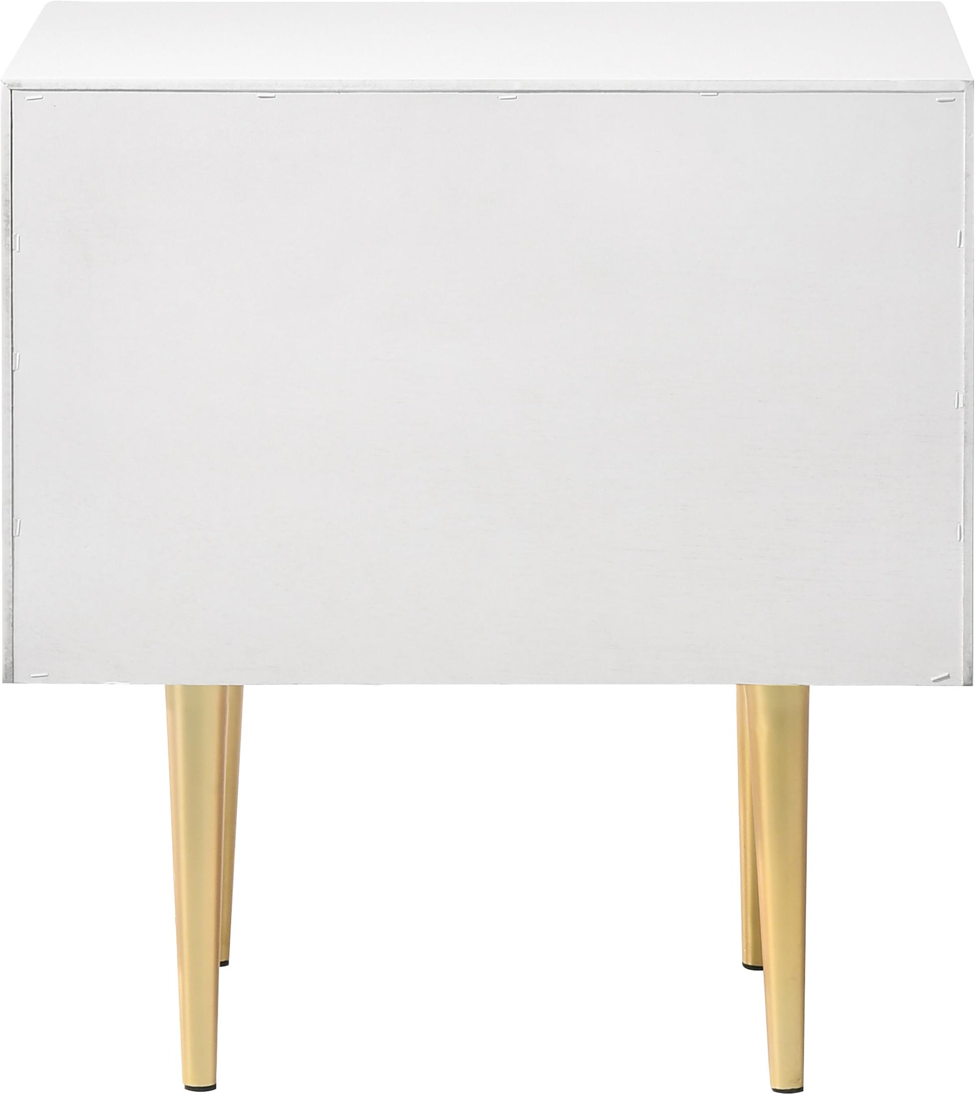 Embody industrialist style with this Modernist night stand in a white medium gloss finish. Utilitarian but sculptural in design, this piece features a ridged, textured look that is chic but sleek. It rests on brushed gold steel legs and has gold brushed handles for a bit of regality. Combine this piece with other items in the Modernist lineup for a cohesive finish to your room makeover.