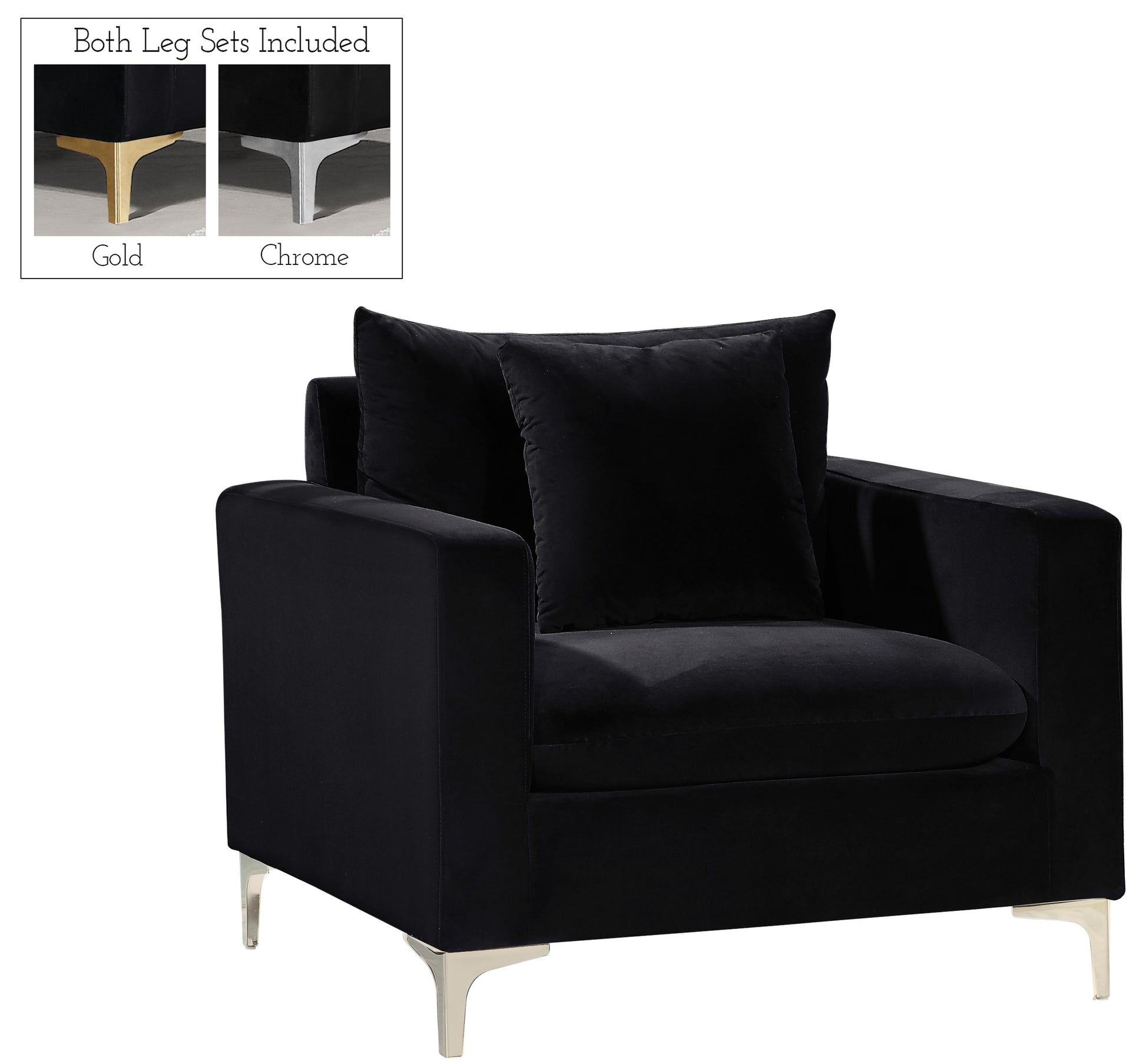 Curl up with a good book from the welcoming confines of this Naomi Black Velvet Chair. The color of this chair adds a bold touch to your decor and shakes up otherwise neutral color schemes. Plush velvet material feels cozy and comfortable against your skin, while deep seat cushions provide lots of room for you to stretch your legs. This chair comes with both gold and chrome legs, so you can customize its look to meet your decor plans. Pillows are included for added homey warmth and comfort.