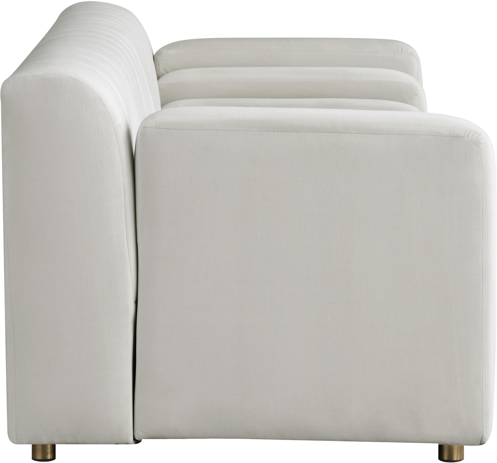 Express your bold, contemporary side with this Naya velvet love seat. This handsome piece is upholstered in cream velvet and blends seamlessly with the other units in the Naya collection, or it looks equally as beautiful on its own. Deep channel tufts run the length of the back, arms and seats of this unit, ensuring its exceptional comfort while giving it a decidedly modern vibe.