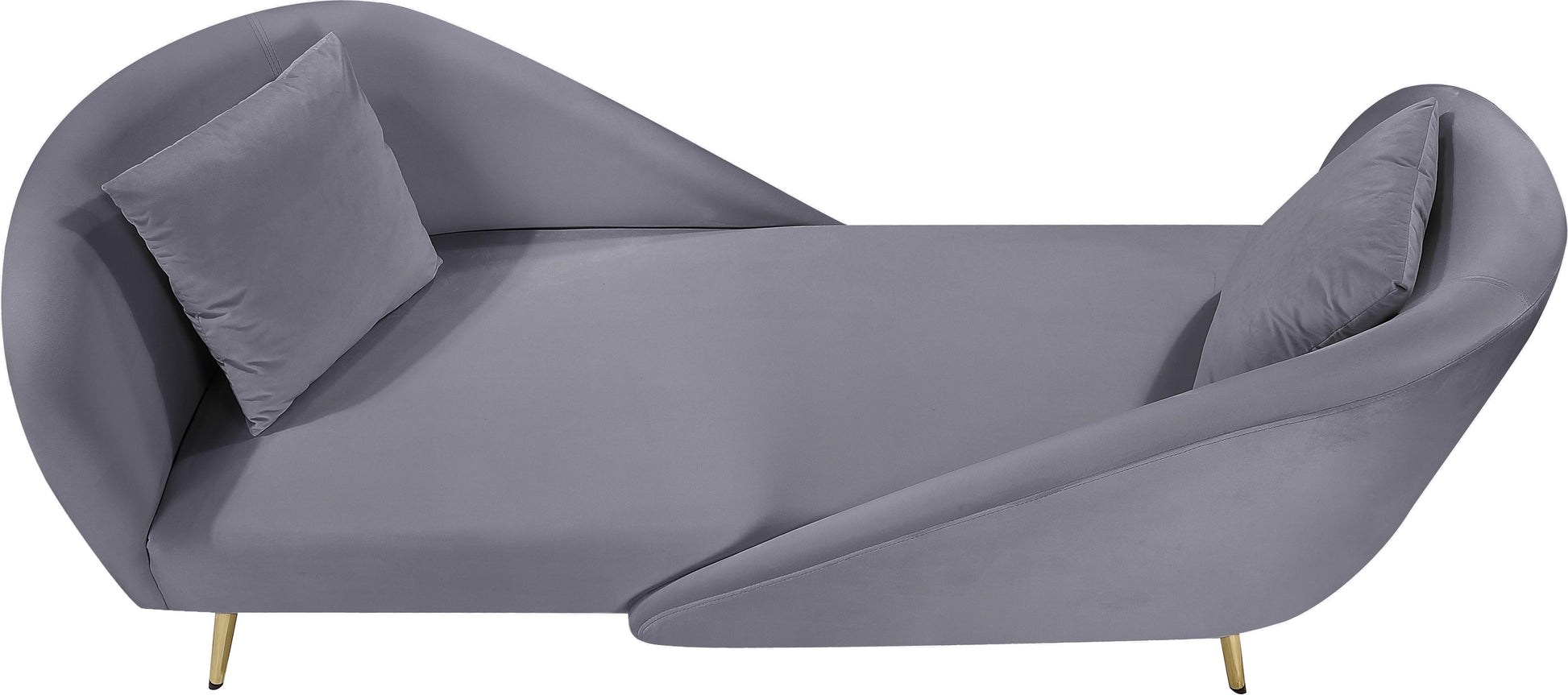 Bring glamour and old world Hollywood appeal to your space with this Nolan velvet chaise. This chaise is outfitted with soft grey velvet to give it added glitz and elegance. It rests atop gold metal legs for a touch of contemporary pizzazz, and it has two backs for a throwback feel that���s nothing short of sophisticated. Use it wherever you want to up the excitement level in your room.