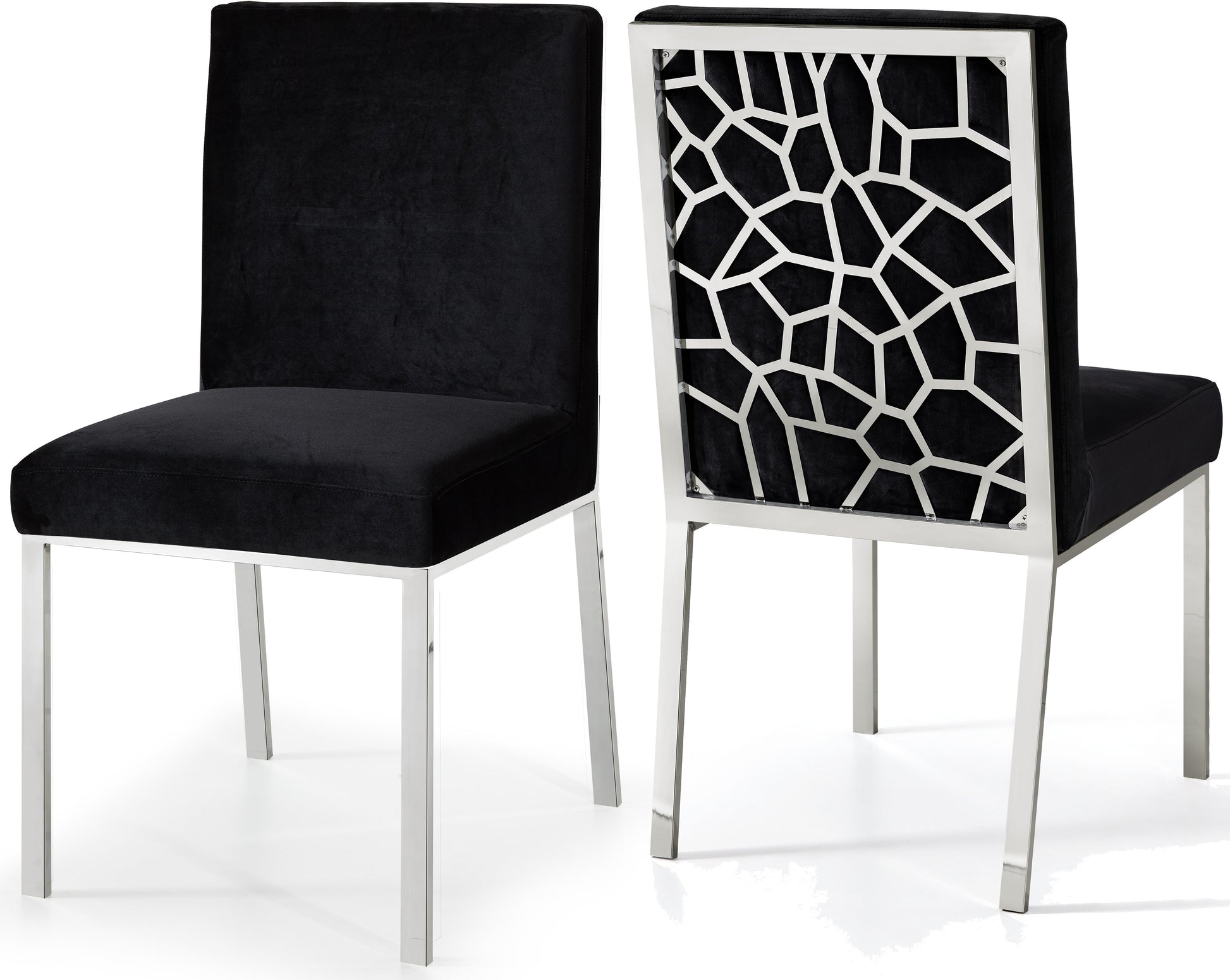 Make dinnertime a stylish affair when guests are seated in this Opal Collection black velvet dining chair from Meridian Furniture. The back of the chair features an intertwined sculptural design with a geometric motif for a modish effect that increases the wow factor in your dining space. Thick, plump seat and back cushions make sitting more comfortable, and each cushion is topped in crushed plush navy velvet for a luxurious touch and soft feel against the skin. The chair's base and back feature stainless steel construction with a chrome finish for a contemporary vibe and sturdy support.