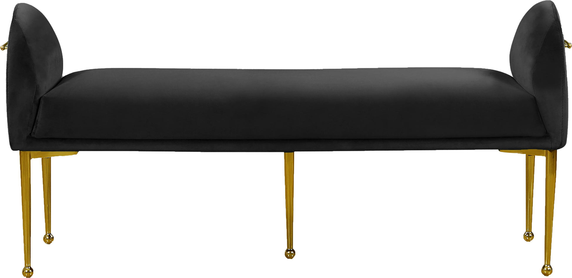 Rest your bones on this beautiful Owen Black Velvet Bench. This handsome bench has an elegant demeanor that will not escape the attention of all who enter your space. The sophisticated polished gold legs have a ball design for a distinctly chic appearance, and the bench is upholstered in rich velvet for a soft and supple feel against your skin. Position it at the end of the bed as a handy seat, or use it in an entryway to give people a spot to sit and put their shoes on before heading out the door.