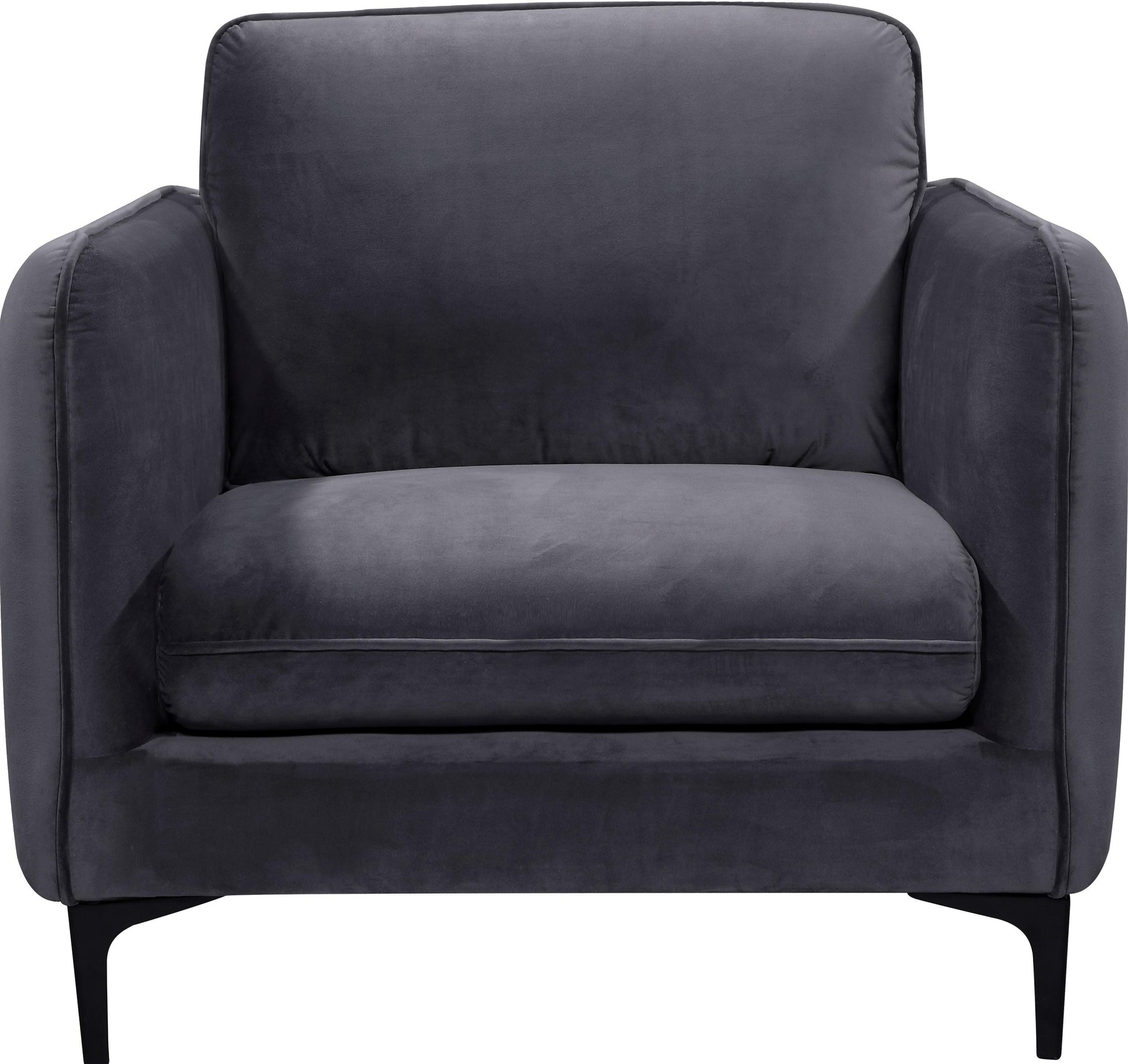 Transform your living space into a chic haven with this stunning Poppy Grey Velvet Chair from Meridian Furniture. Rich grey velvet upholstery creates a soft, luxurious space for you to curl up with a book or in front of the TV on a rainy day, or just kick back and relax after a long day at work. Its plush back cushion offers ample support for your back while adding to the chair's contemporary design, and matte black metal legs pull the piece together, making it a stylish choice for any room.
