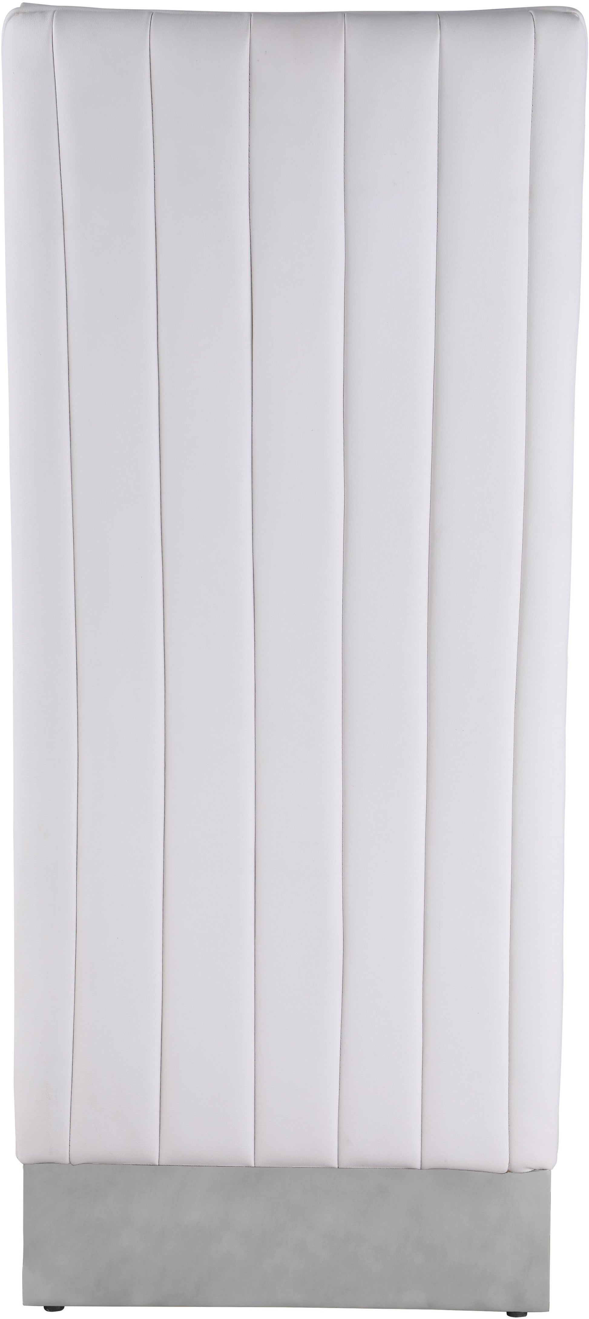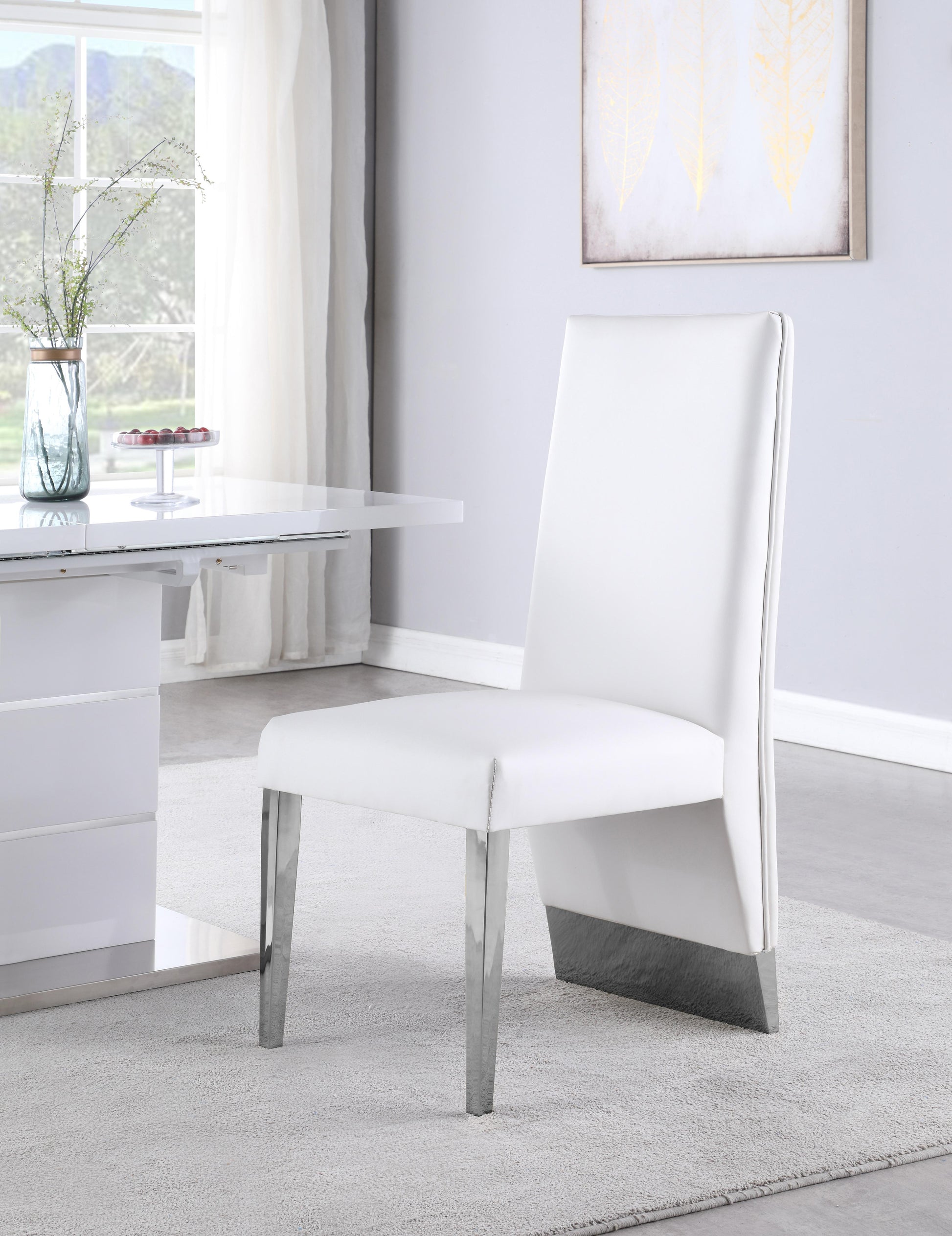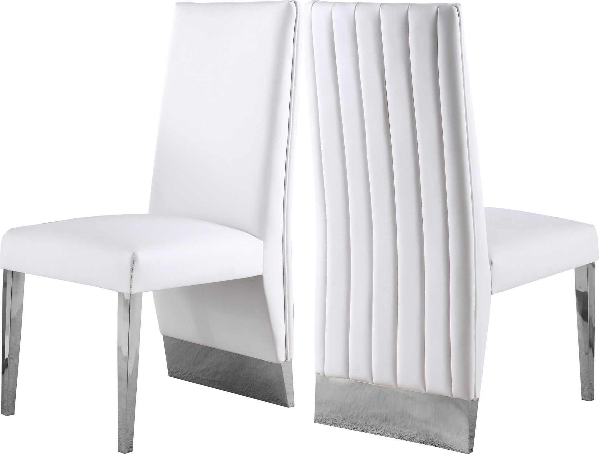Bring the luxe look of this Porsha chair to your dining space. Impressing guests is simple when they're seated in this chair. The floor-length back is elegantly beautiful and creates a striking silhouette from every angle. Faux Leather upholstery material in a sophisticated hue of white adds a touch of modernity to this chair, and the reverse is channel tufted for added elegance and refinement. Gold legs complete the look for added contemporary panache and sturdy support.