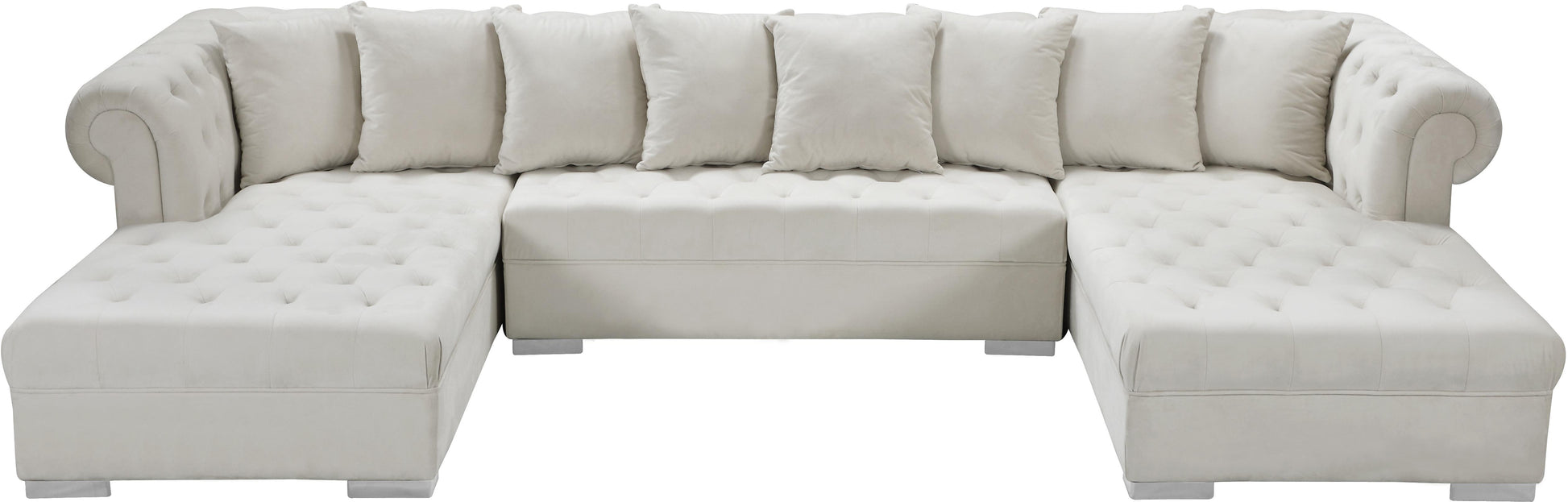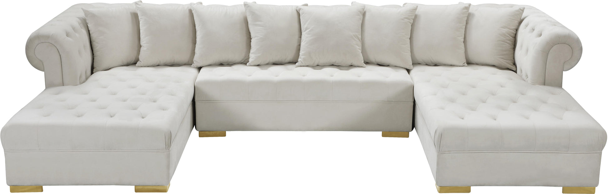 Get ready to relax after a long day with this Presley Cream Velvet 3pc. Sectional from Meridian Furniture. Featuring rich cream velvet upholstery with deep tufting and comfy pillows, this double chaise sectional provides a luxurious, cozy space to kick back and watch TV, take a nap, or curl up with a nice book. Complete sets of gold and chrome legs complement your contemporary home decor while providing solid support for the sectional's frame.