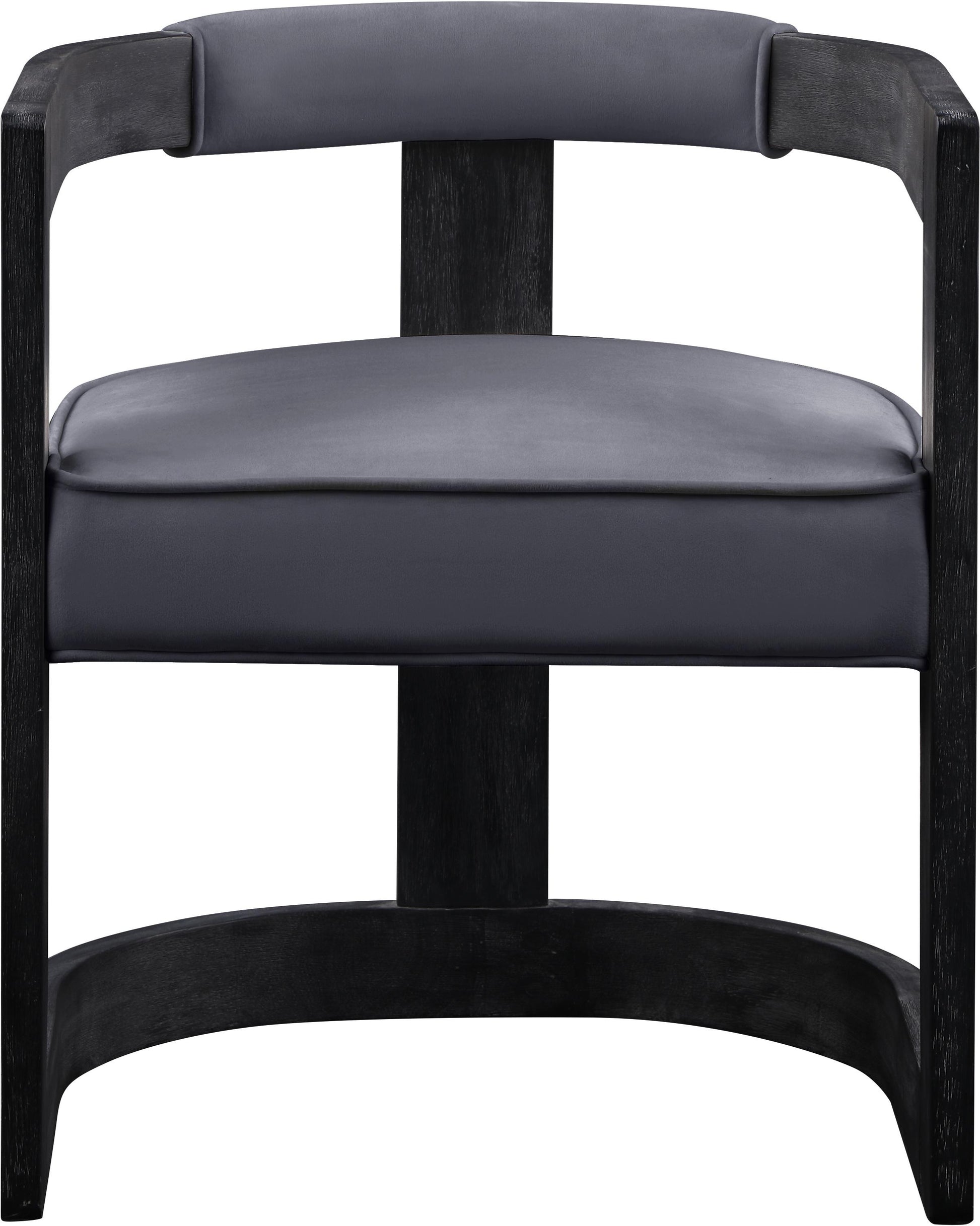 Guests will be overly impressed when you seat them in this Regency velvet dining chair. Solid wood construction lends the chair a durable start while its dark grey finish gives it an upscale, almost affluent look. This contemporary chair is outfitted with soft grey velvet cushioning against its rounded back and seat, ensuring comfort as you dine.