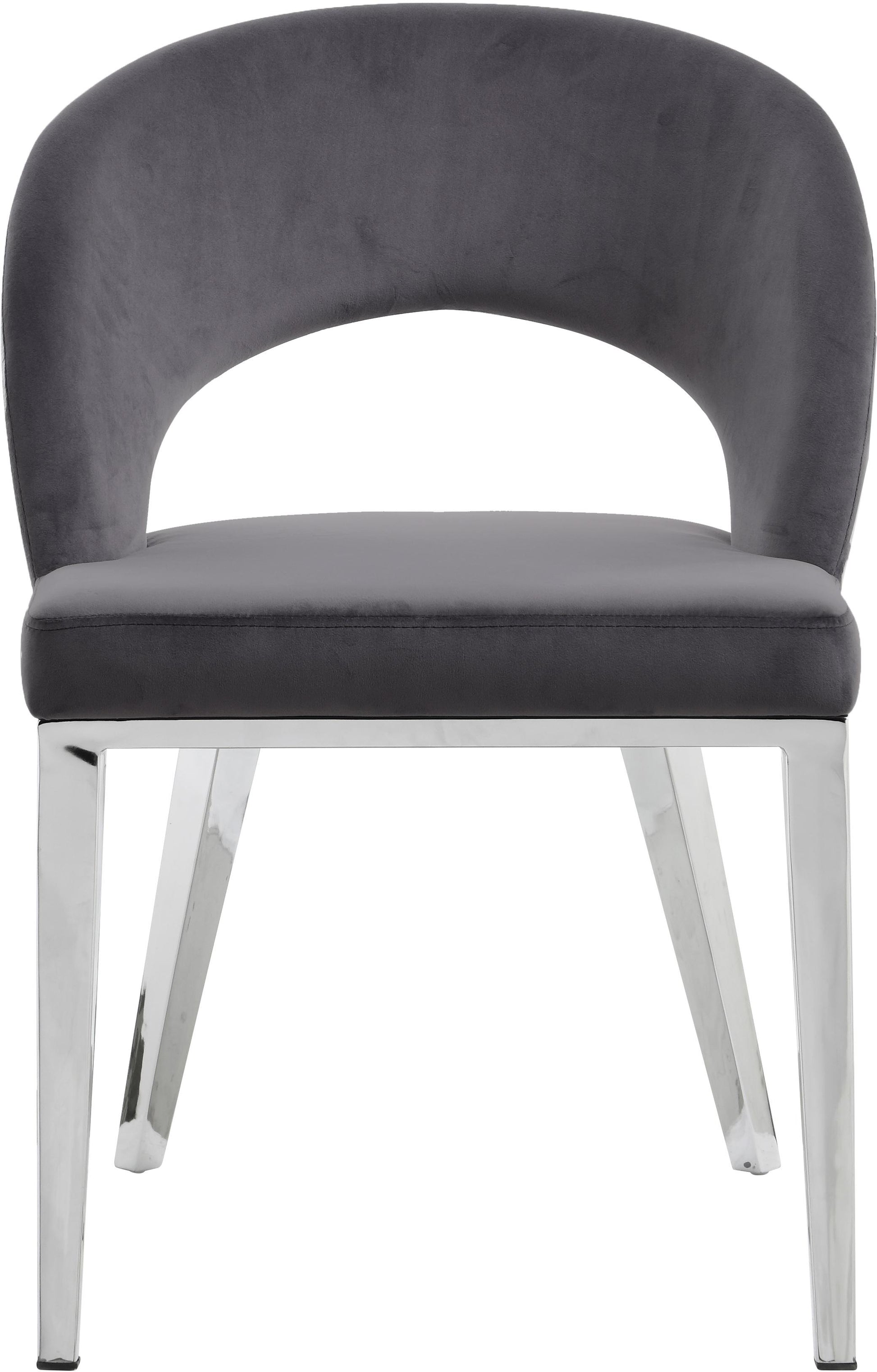 Seat dinner guests in elegant style with the Roberto grey velvet dining chair from Meridian Furniture. This fabulous chair features a rounded back with strategically placed opening for visual beauty and to allow air flow while you dine. The rich grey upholstery is chic and modern, and it has a soft feel against the skin. This chair rests on steel iron for superb support, and each leg is finished in chrome for a modish slant that meshes well with your up-to-the-minute dining room decor.