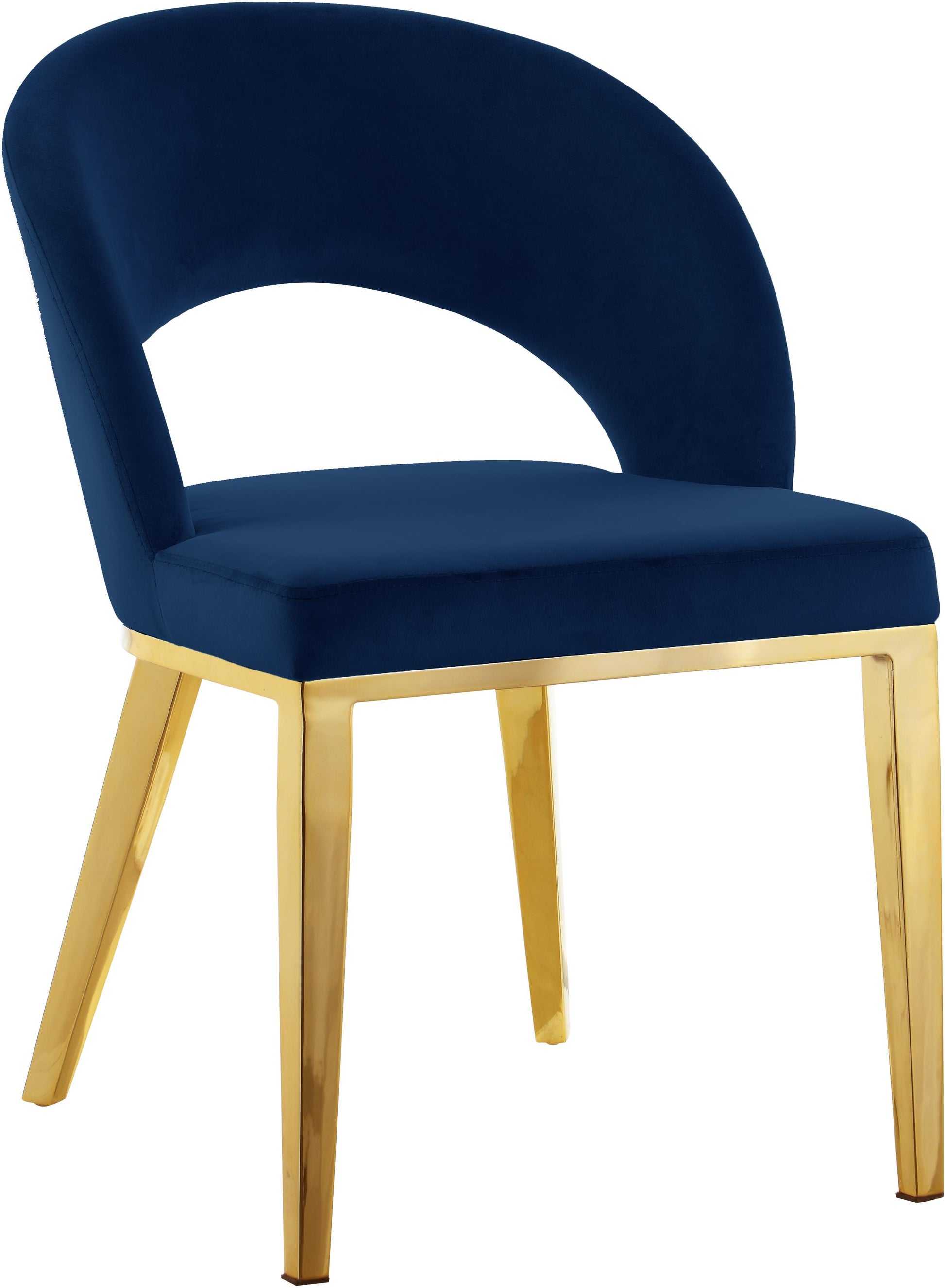 Seat dinner guests in elegant style with the Roberto navy velvet dining chair from Meridian Furniture. This fabulous chair features a rounded back with strategically placed opening for visual beauty and to allow air flow while you dine. The rich navy blue upholstery is chic and modern, and it has a soft feel against the skin. This chair rests on iron legs for superb support, and each leg is finished in chrome for a modish slant that meshes well with your up-to-the-minute dining room decor.
