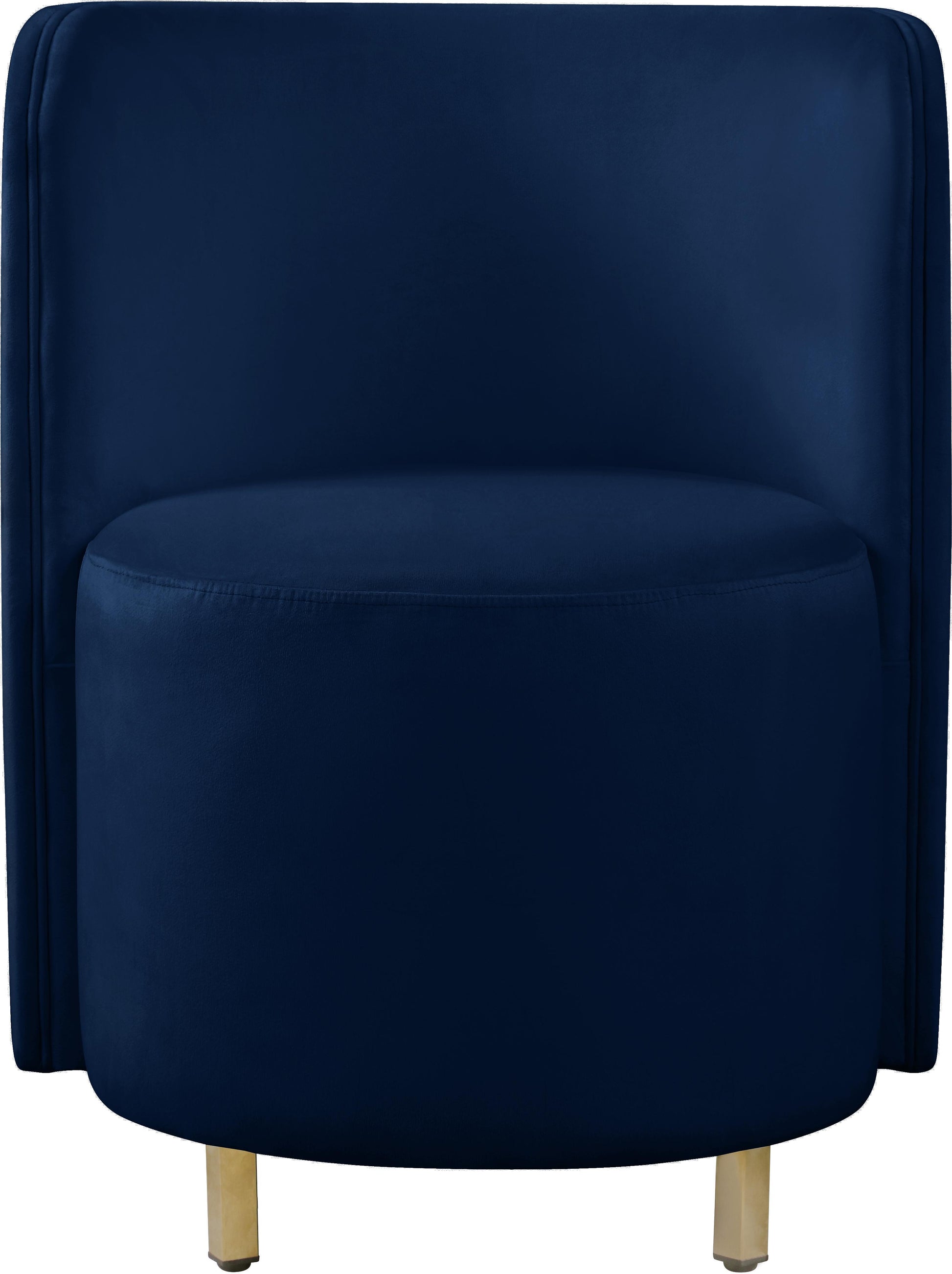 Create an envious look in your living room, parlor, bedroom or boudoir with this Rotunda velvet chair. This svelte little chair features a glamourous Hollywood vibe with its floor-length back and barrel design. The soft navy velvet upholstery lends it an added upscale feel, and the gold metal legs round out its contemporary panache. A wooden frame makes the chair a sturdy addition to any room.