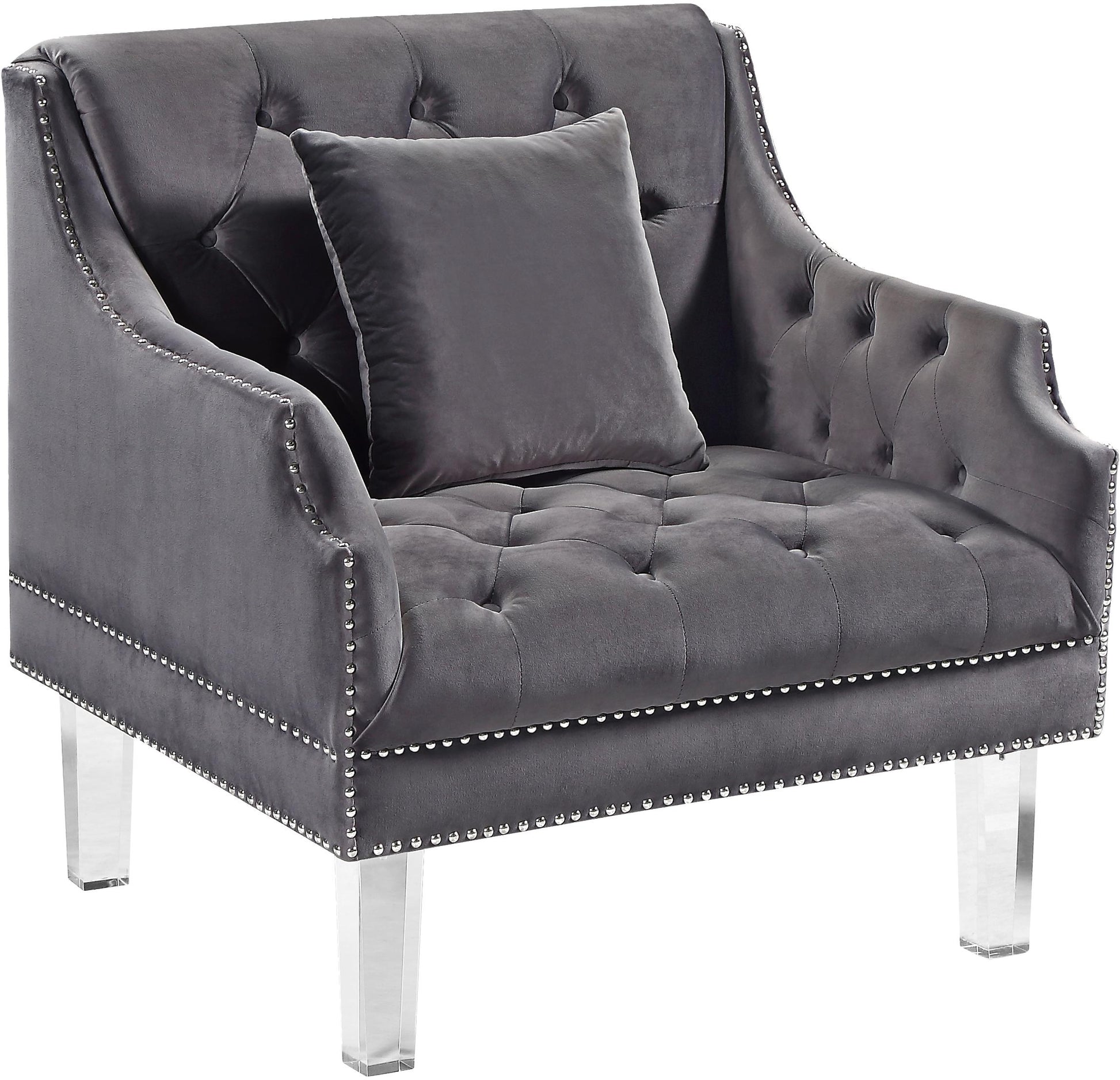 Bring a posh look home with this Roxy Grey Velvet Chair. The velvet is both striking yet unobtrusive, giving your room an elegant style boost while providing you with a comfortable spot to sit and relax while reading or watching TV. Deep button tufting gives the chair a touch of texture while ensuring its sophistication is lost on no one. Add this contemporary chair on its own to your living room or den, or buy it alongside the coordinating sofa and loveseat for a complete and total makeover.