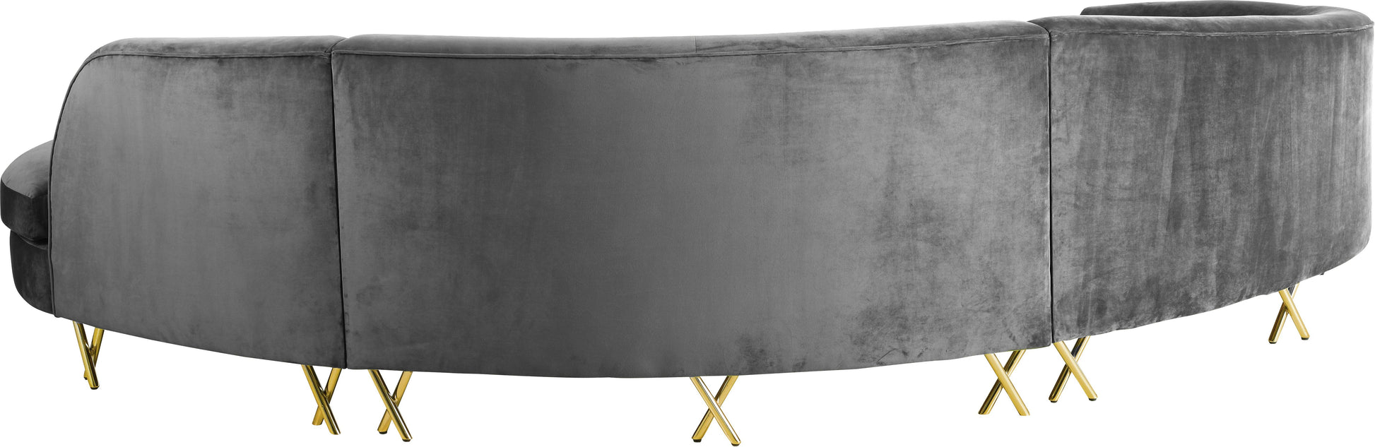 Relax in regal comfort with this stunning grey velvet Serpentine three-piece sectional sofa. Plush grey velvet upholstery provides a soft, cozy place for you to rest after a long day, and gold steel legs add just the barest touch of color to the sectional's chic design. Its lengthy design offers ample room for you to kick back and relax, either on your own after a long, hard day, or with your loved ones during family movie night.
