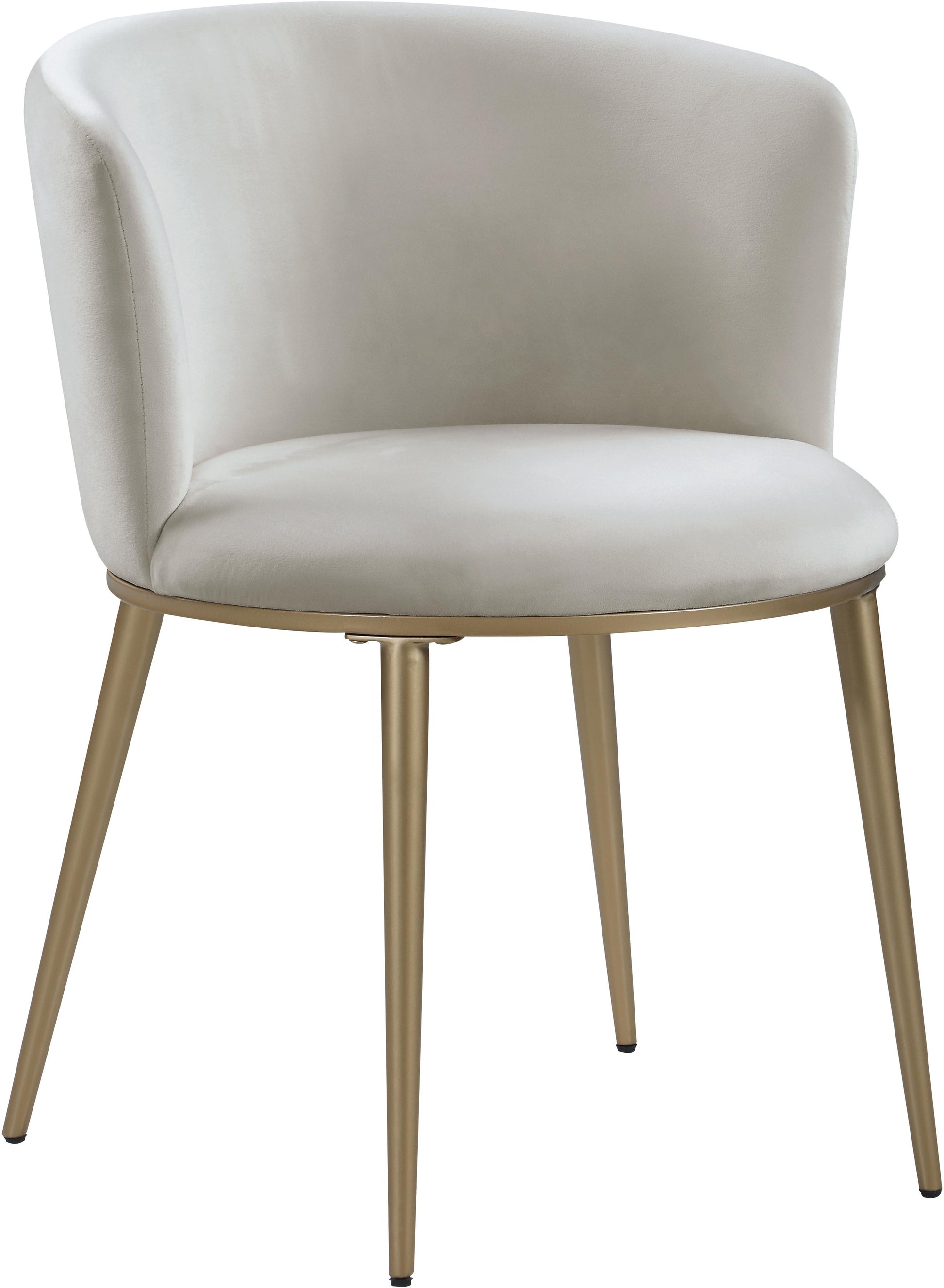 Enhance your d?�cor with the Skylar cream velvet dining chair, due to its petite silhouette and artistic style. A soft round cushion and gently curving cushioned back give this chair an ageless quality that belies its contemporary design. A brushed gold base is supported by four tapering gold legs, and it weighs only 11 pounds overall. Easily paired with any of several available tables, this chair is equally well-suited to use in a conversation grouping.
