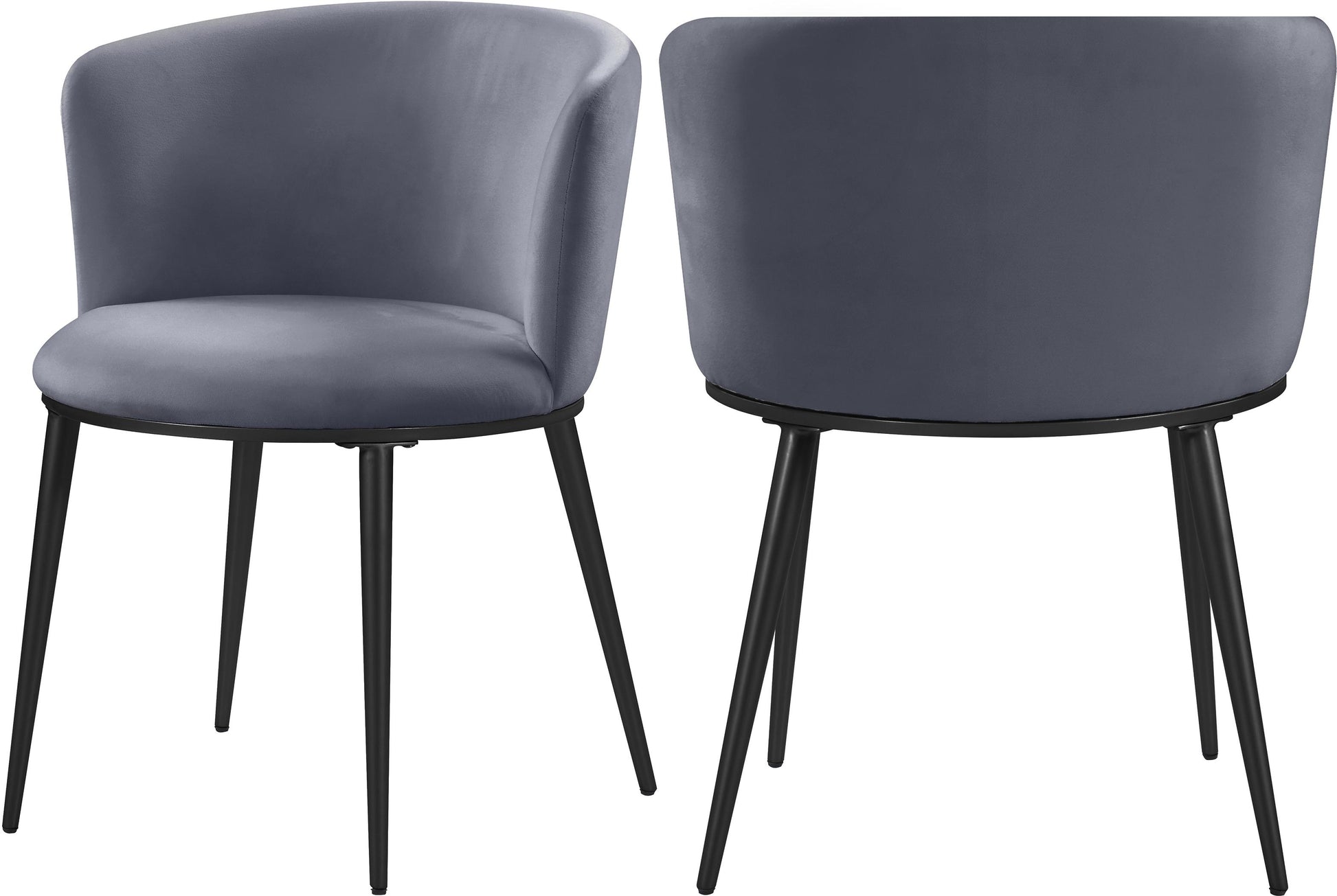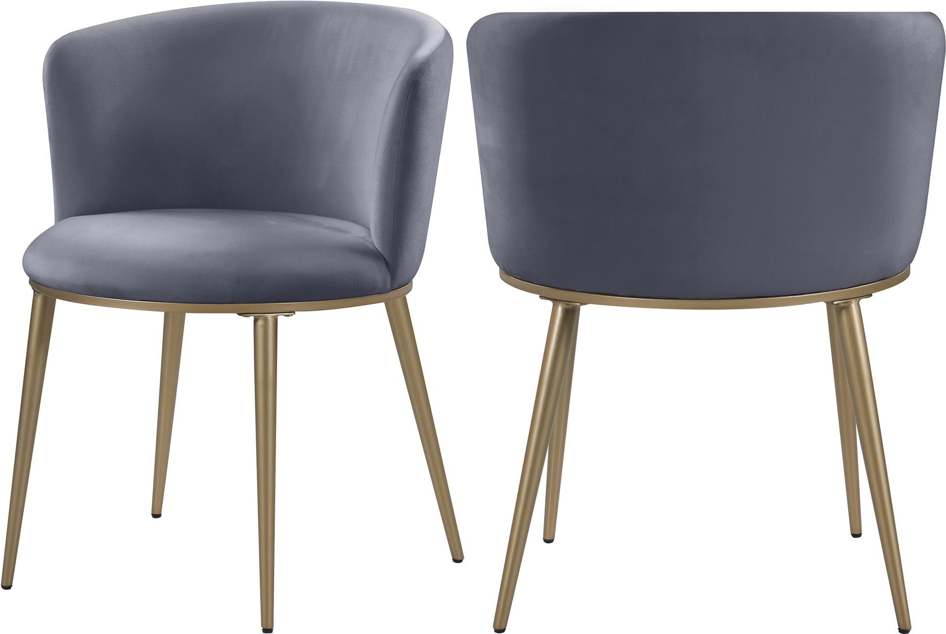 Enhance your d?�cor with the Skylar grey velvet dining chair, due to its petite silhouette and artistic style. A soft round cushion and gently curving cushioned back give this chair an ageless quality that belies its contemporary design. A brushed gold base is supported by four tapering gold legs, and it weighs only 11 pounds overall. Easily paired with any of several available tables, this chair is equally well-suited to use in a conversation grouping.