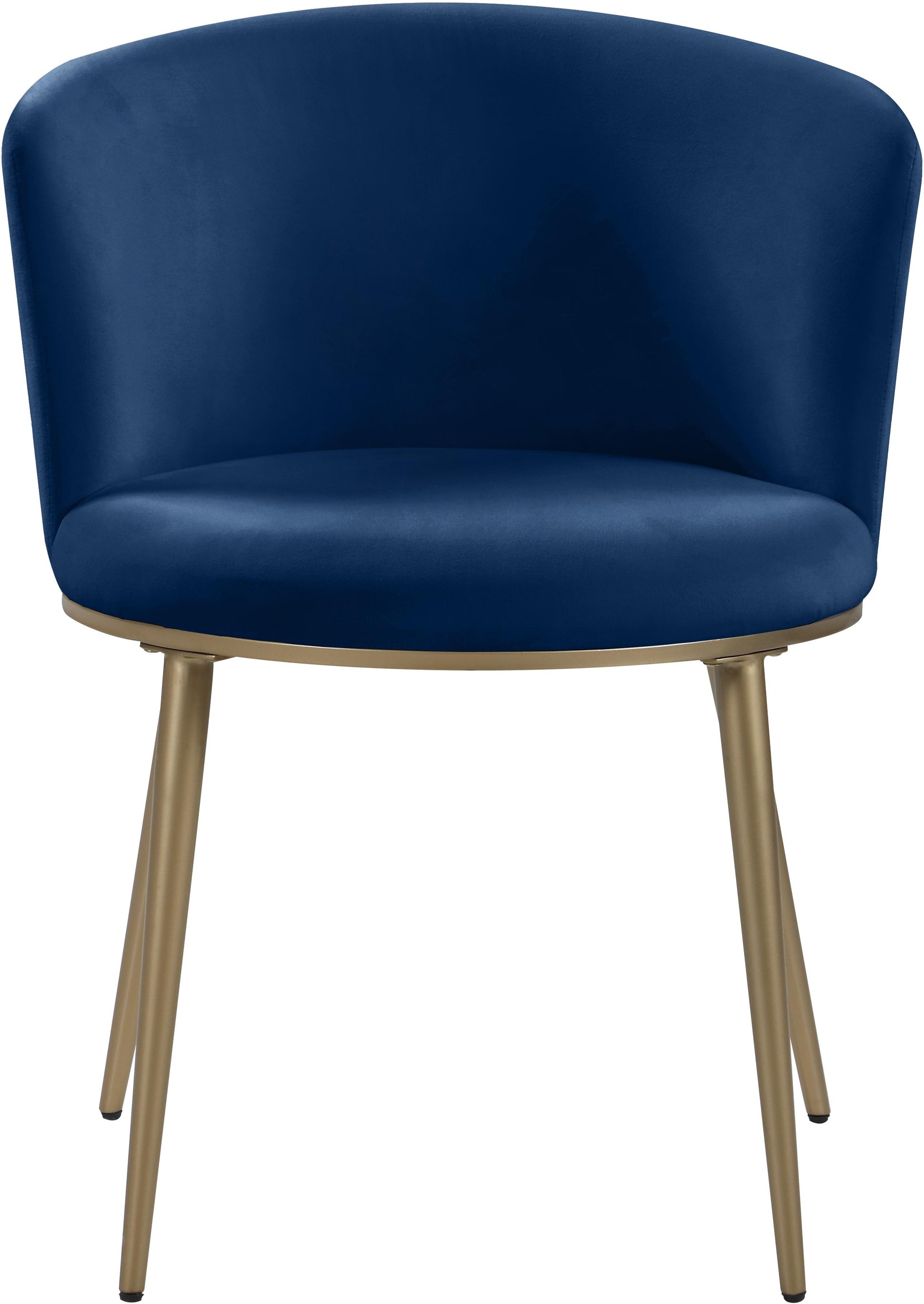 Enhance your d?�cor with the Skylar navy velvet dining chair, due to its petite silhouette and artistic style. A soft round cushion and gently curving cushioned back give this chair an ageless quality that belies its contemporary design. A brushed gold base is supported by four tapering gold legs, and it weighs only 11 pounds overall. Easily paired with any of several available tables, this chair is equally well-suited to use in a conversation grouping.