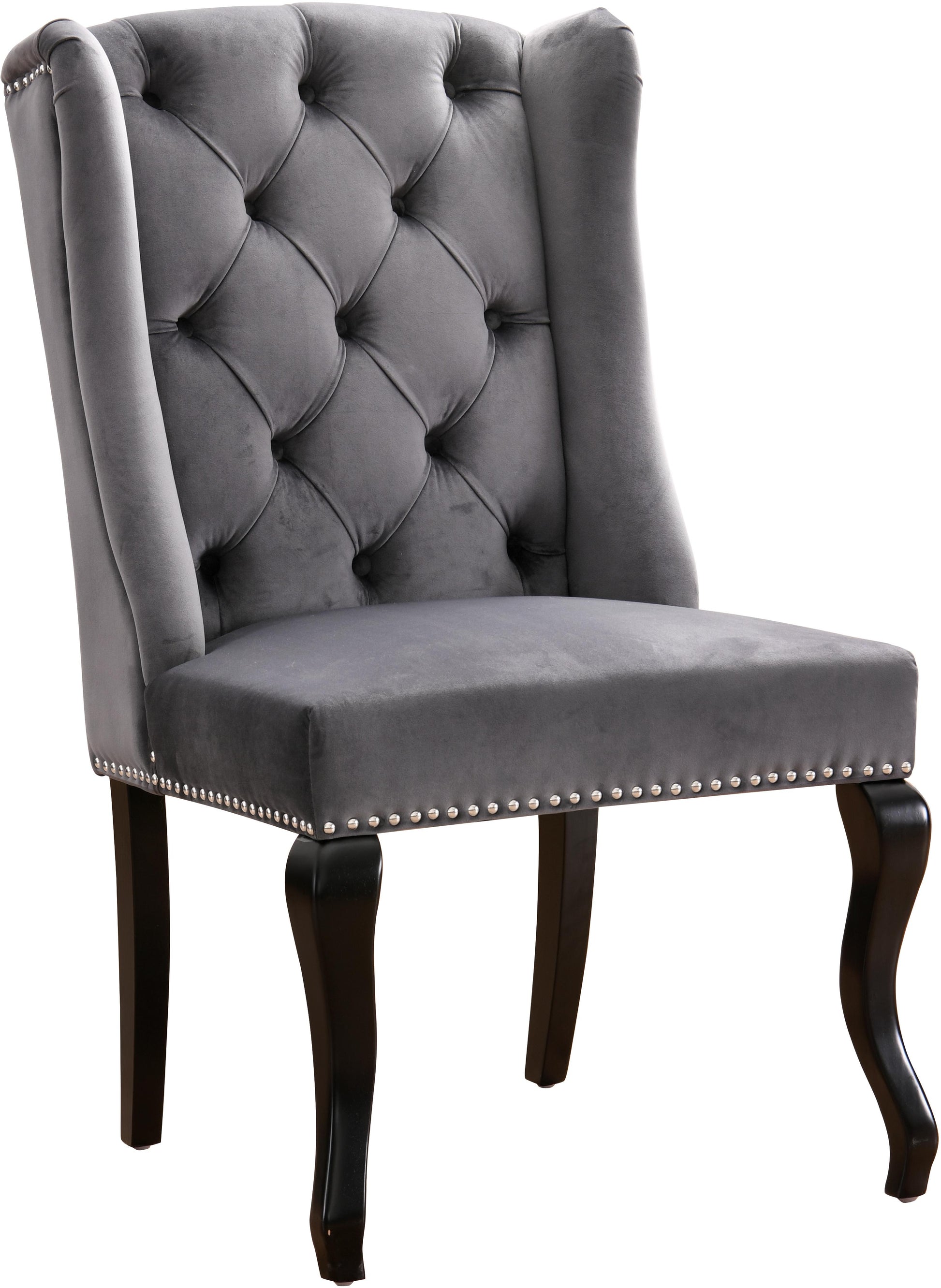 Bring luxury to mealtime with the Suri Grey Velvet Dining Chair. This chair has a curvy, high back with an elegant look that blends modern with traditional. The back is tufted to prevent shifting of the padded cushion, and the chair has chrome nail head trim for added beauty and resilience. A chair knocker on the back lends an extra element of elegance to the design, and the wooden legs provide sturdy support and complete the design on a timeless note.