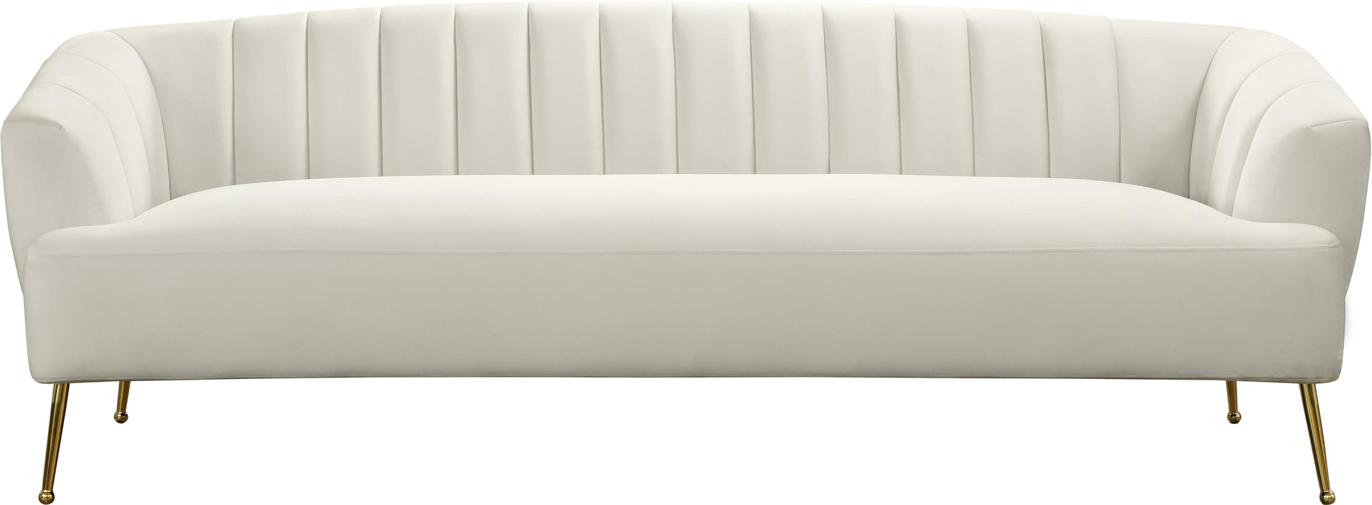 Dress up your living room space with this Tori Velvet Sofa. This plush sofa features chic cream velvet upholstery that covers every square inch, adding a sumptuous and svelte look to your room. The gold legs with a ball design on the foot adds to the elegant look of this pretty chair, and deep channel tufting adds loft to the back and arms for a lavish feel when you sit down to relax and unwind at day���s end.