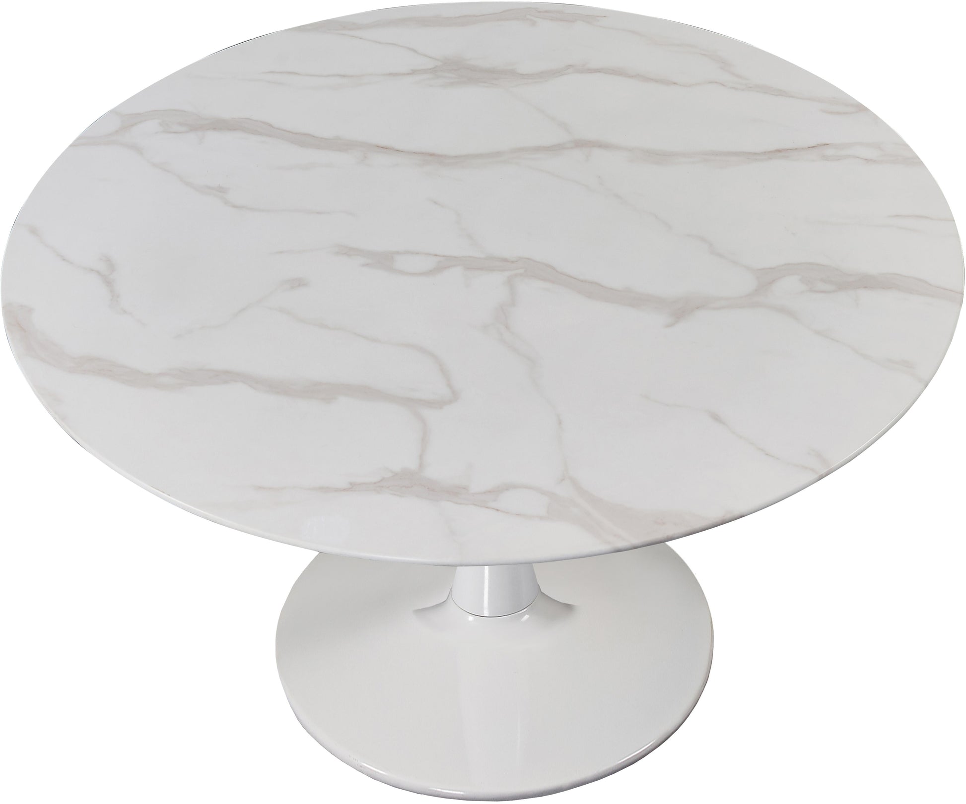 Add the Tulip 48" dining table to your kitchen, den or office to enjoy its petite size and elegant lines. The tabletop is made of 10MM thick glass with a glamorous marble veneer. A rich white pedestal base adds to the appeal of this gorgeous piece, and lets it fit into smaller spaces comfortably. Choose from a wide array of available matching chair styles to complete your contemporary style d?�cor.