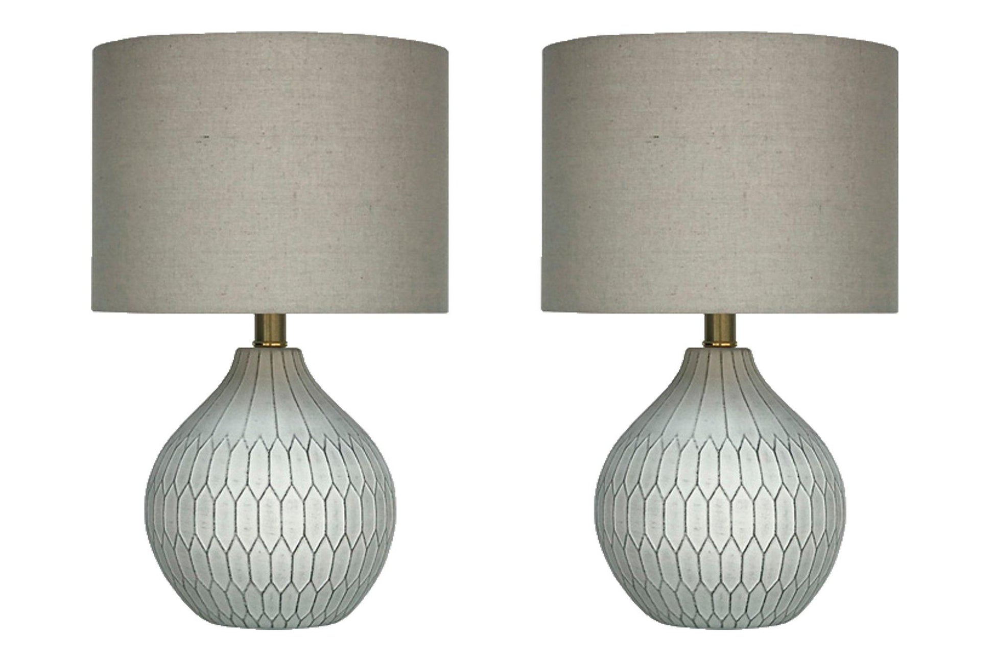 Fresh and light, the dimensional design of this delightful ceramic table lamp set borrows from a retro theme to update a transitional space. Made of ceramic with an antiqued white finish, these accent lamps infuse personality into any setting. Add them to a console or end table and bring out the bright in any decor.More About This Product