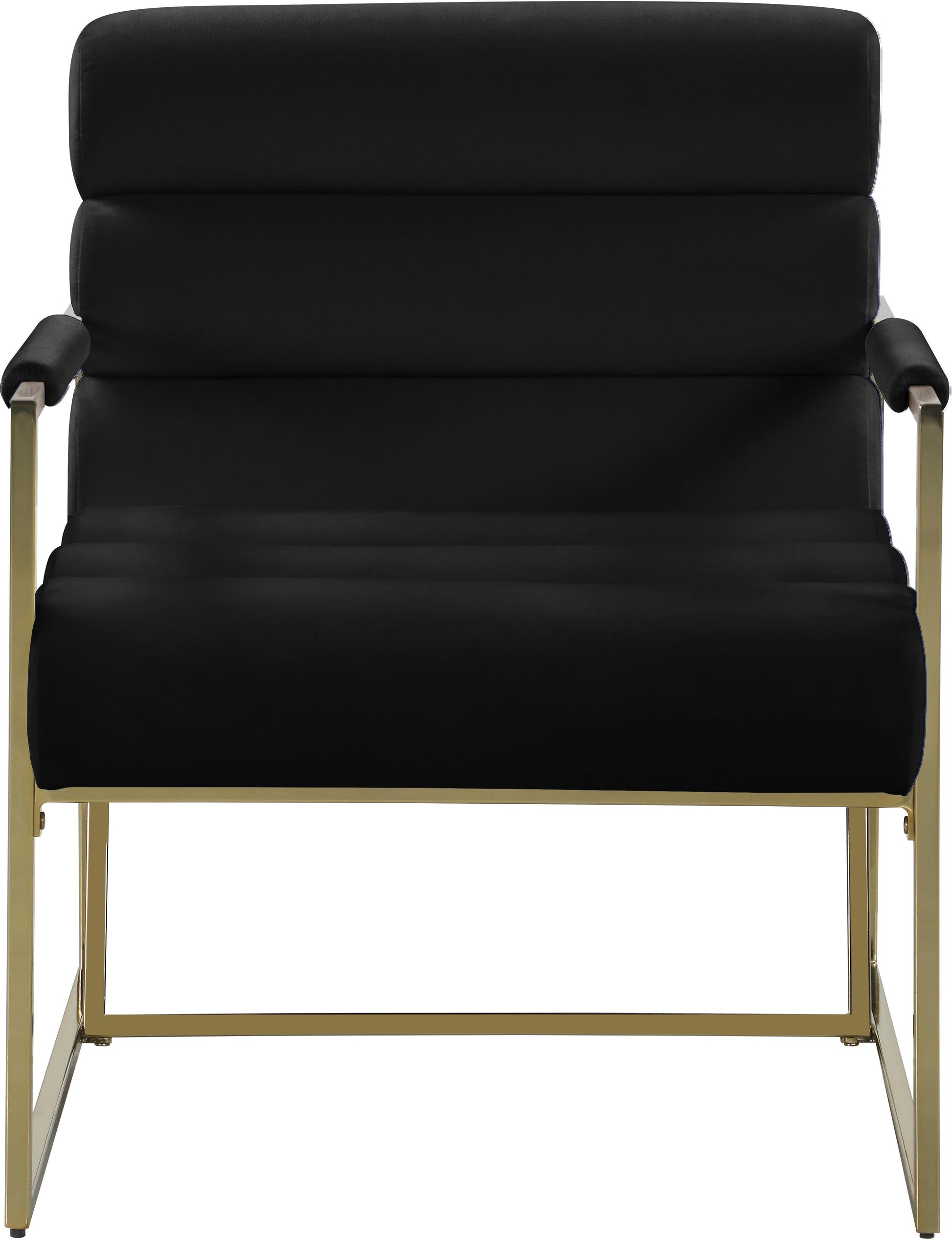 This Wayne velvet accent chair is a fitting addition to any contemporary interior space. Lovely soft black velvet feels sleek and chic to the touch, ensuring thatyou'rere seated in total comfort. Deep channel tufting along the back and seat of the chair and its padded arms add to its comfort potential. The chair���s gold iron frame adds to its contemporary design and lends it the sturdiness needed for years of beautiful use.