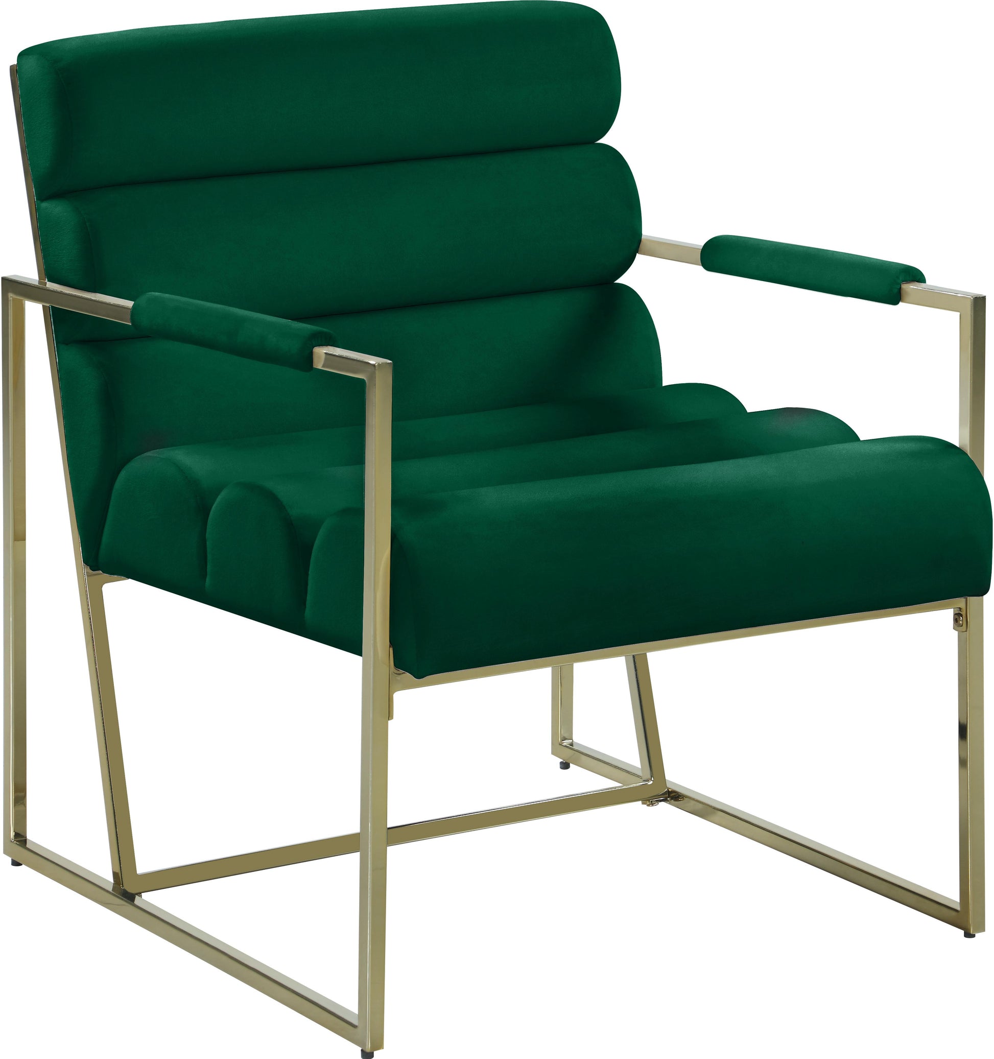This Wayne velvet accent chair is a fitting addition to any contemporary interior space. Lovely soft green velvet feels sleek and chic to the touch, ensuring thatyou'rere seated in total comfort. Deep channel tufting along the back and seat of the chair and its padded arms add to its comfort potential. The chair���s gold iron frame adds to its contemporary design and lends it the sturdiness needed for years of beautiful use.