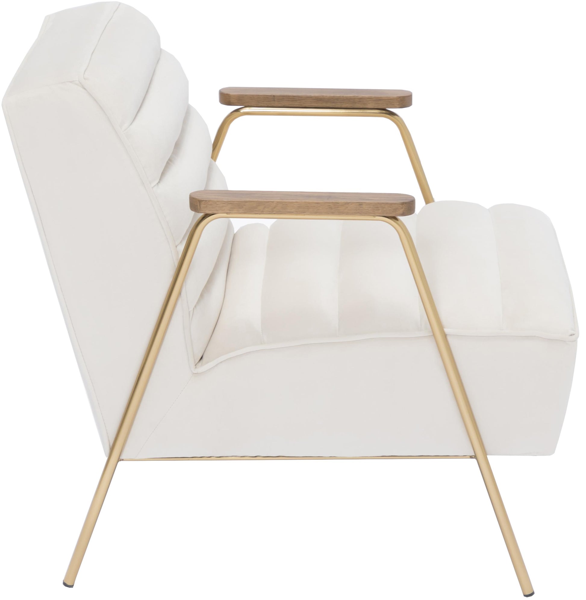 Go mod in your living room, den or other space with this Woodford velvet accent chair. This lovely addition to your home features soft cream velvet upholstery for a lavish look in any room. The back and seat are channel tufted for added resilience and lasting beauty. The metal frame adds enduring quality to this chair, and the brushed gold metal legs and wood arms lend it a definitive contemporary vibe.