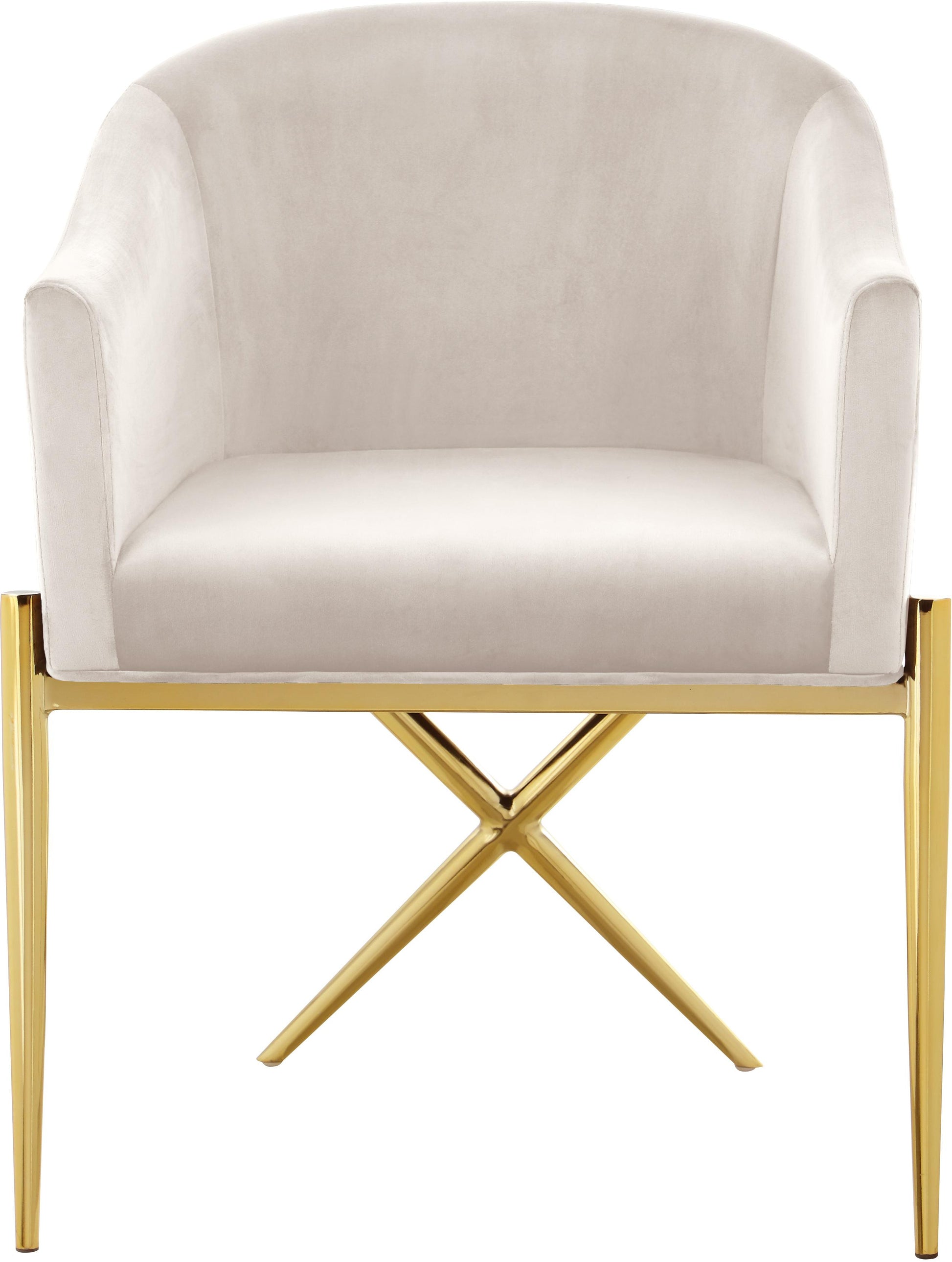 Spread elegance and modernity to your dining room with this Xavier Cream Velvet Dining Chair from Meridian Furniture. This beautiful chair features a simple barrel seat with a plush cushion and back, ensuring that every meal is a comfortable one. The gold steel legs provide durable support while you sit, and an "X" leg in the back lends the chair an uber-modern vibe. Gold finishing on the base is sleek and chic, giving this chair a contemporary edge that's well at home in any modern dining room. Sleek cream velvet upholstery is durable and tough yet soft against your body, elevating meal times to a luxurious experience.
